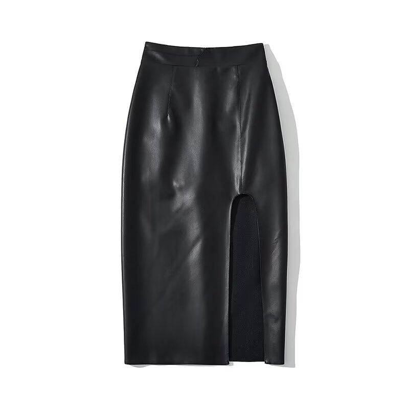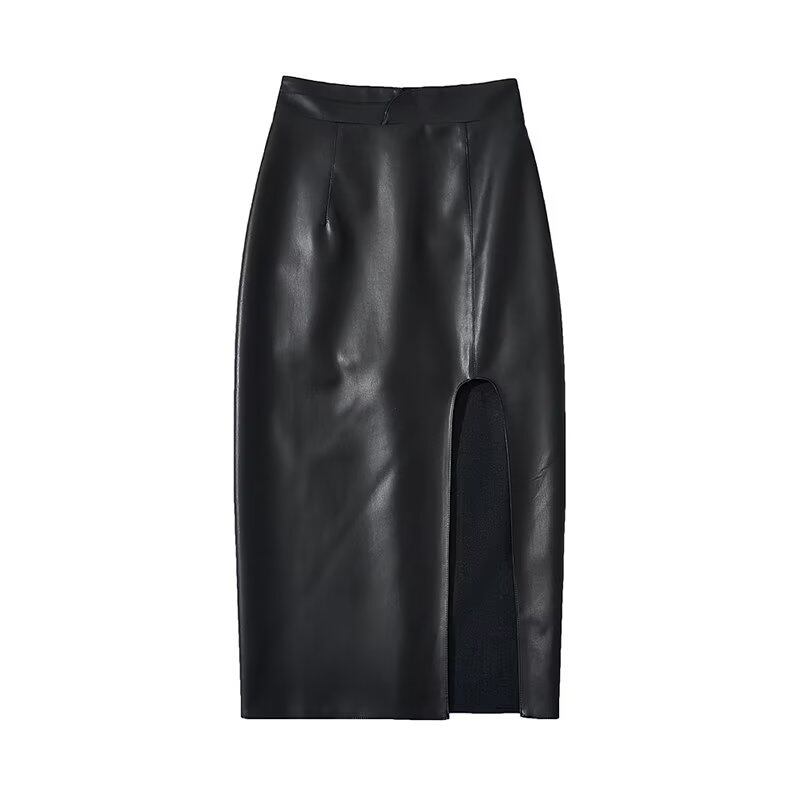 [EWQ] レディース スプリット ブラック PU レザー スカート ミッドカーフ スカート 春夏 ファルダス 16Y6203 スプリング 春物 サマー 夏物