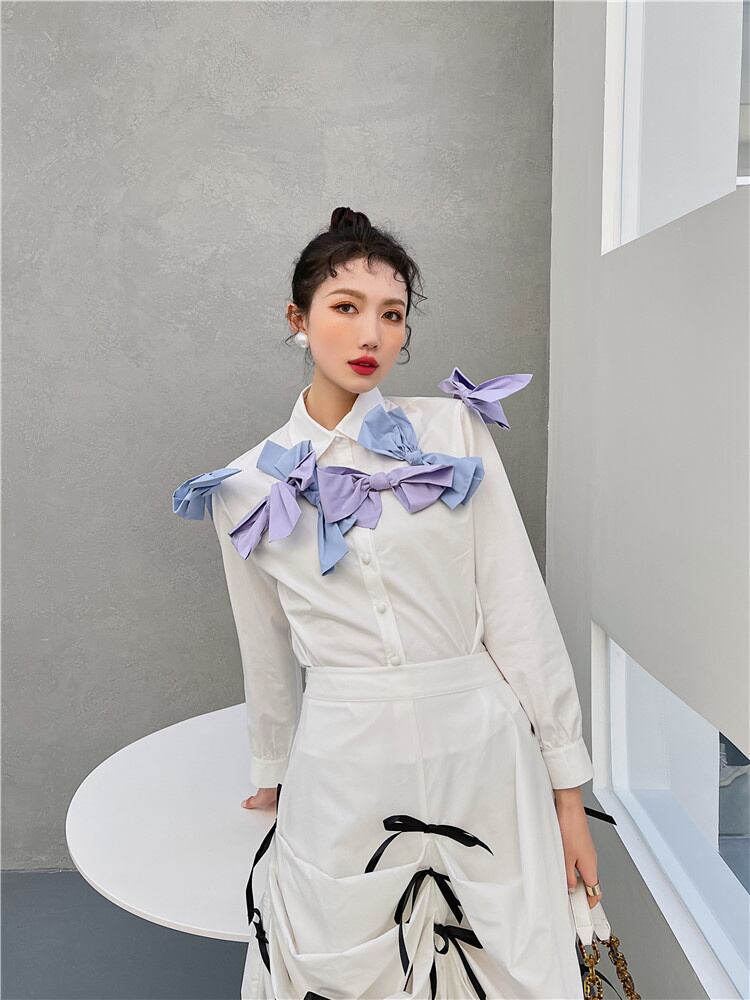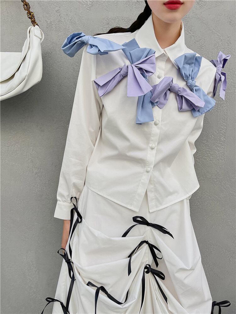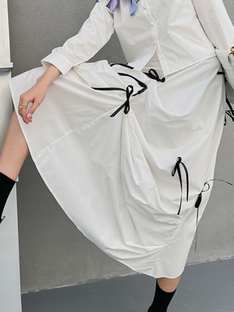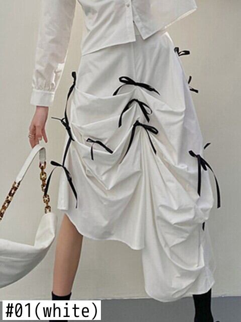 [EWQ] 蝶ネクタイ非対称 A ラインスカートコントラストカラー不規則ミッドカーフスカート夏潮オールマッチ服 8059 リボン サマー 夏物 Aライン