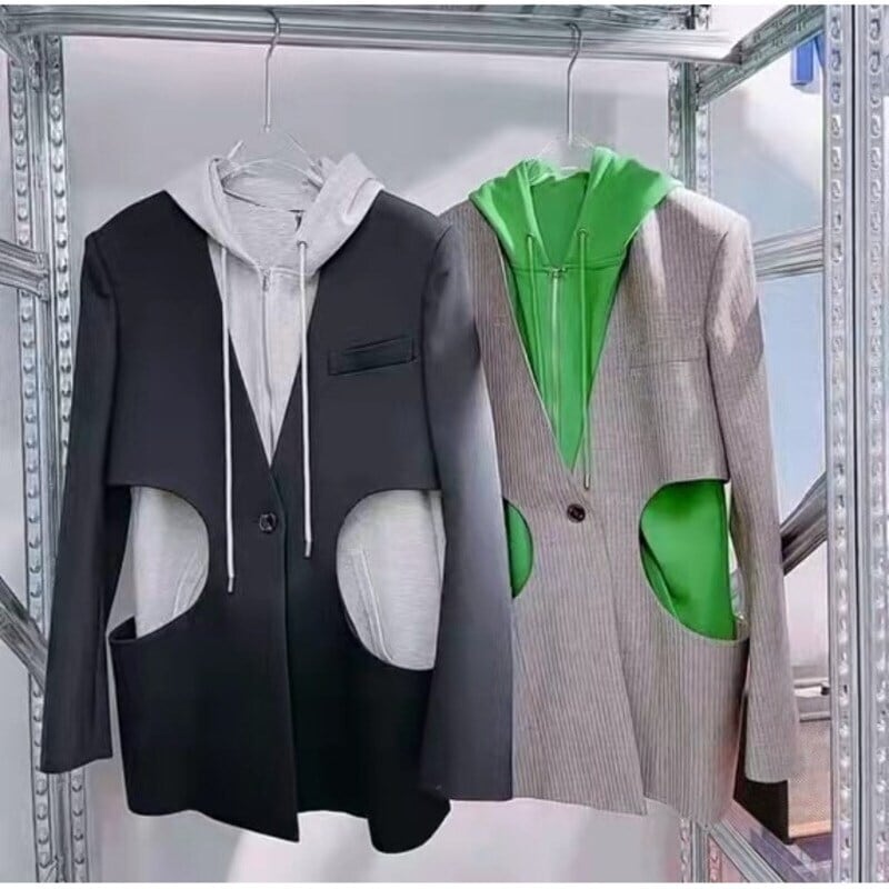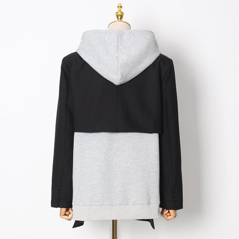 [EWQ] カラーブロック パッチワーク コート レディース トップス フード付き 襟 長袖 中空アウト ブレザー 春 フェイク ツーピース ロング スプリング 春物