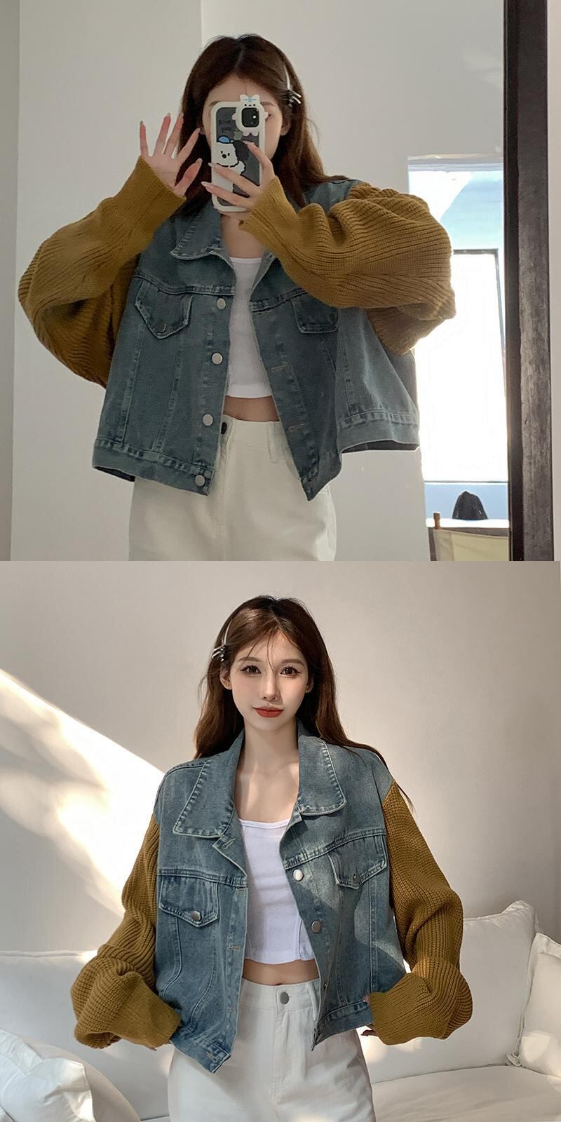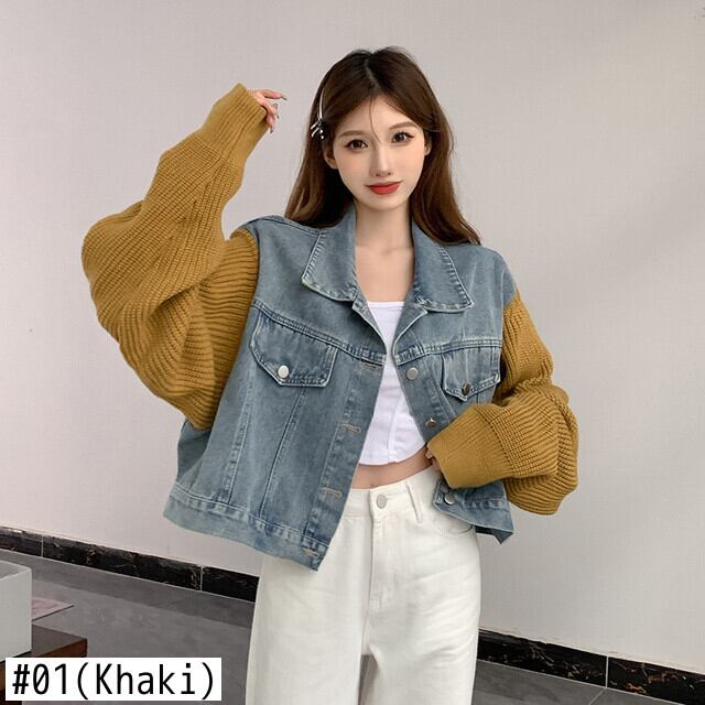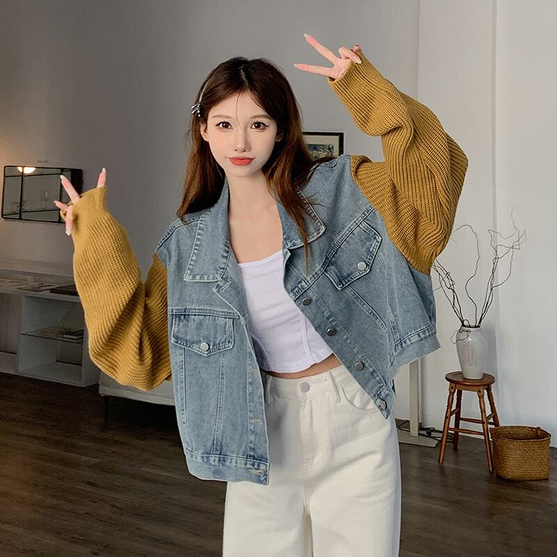 [EWQ] セーター長袖スプライシングデニムジャケットパッチワークターンダウンカラージャケットコート春秋 16Y6604 ロング スプリング 春物 オータム 秋物