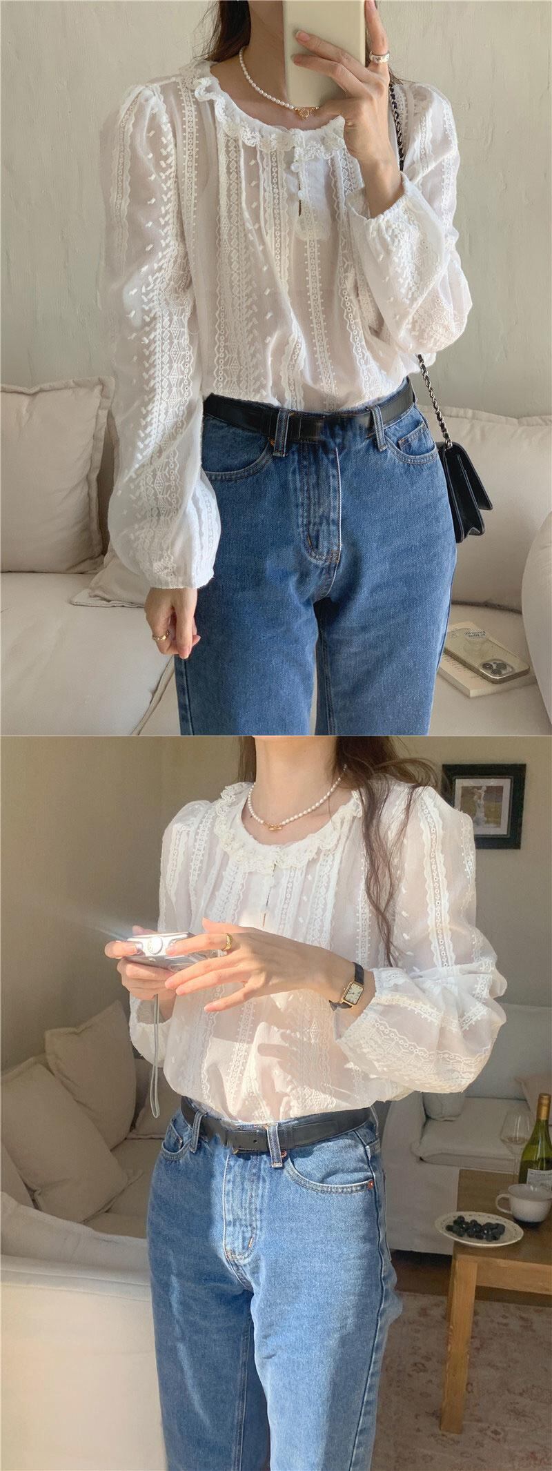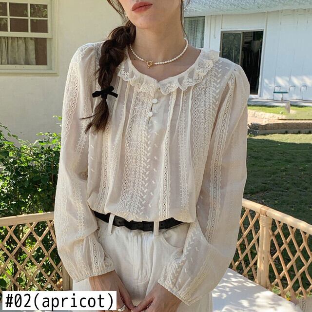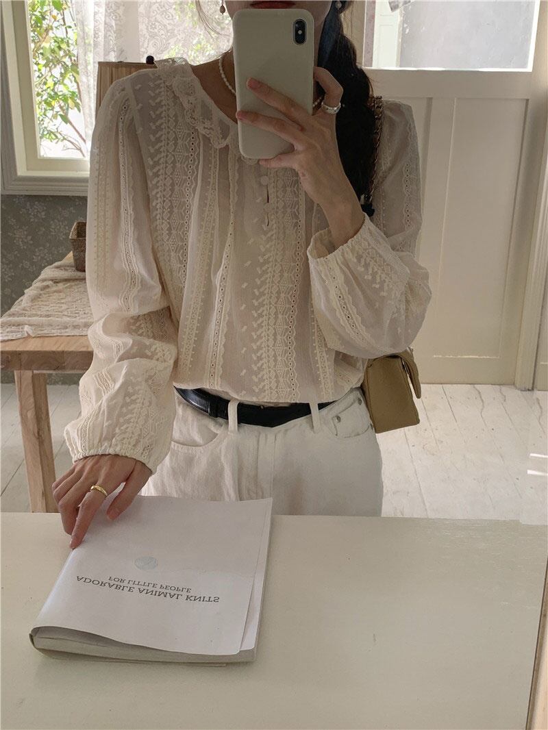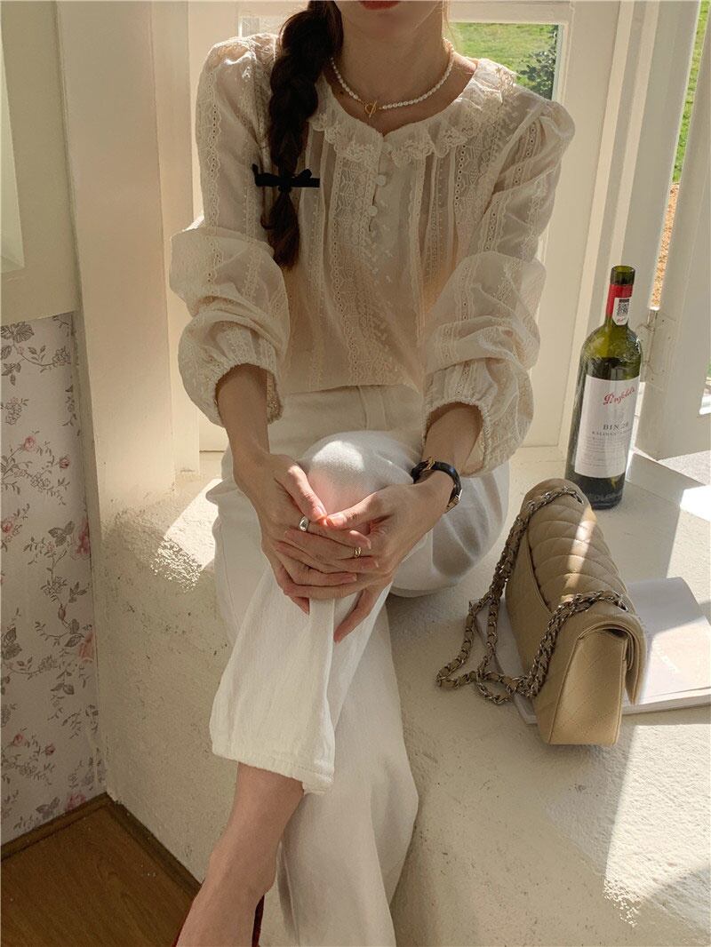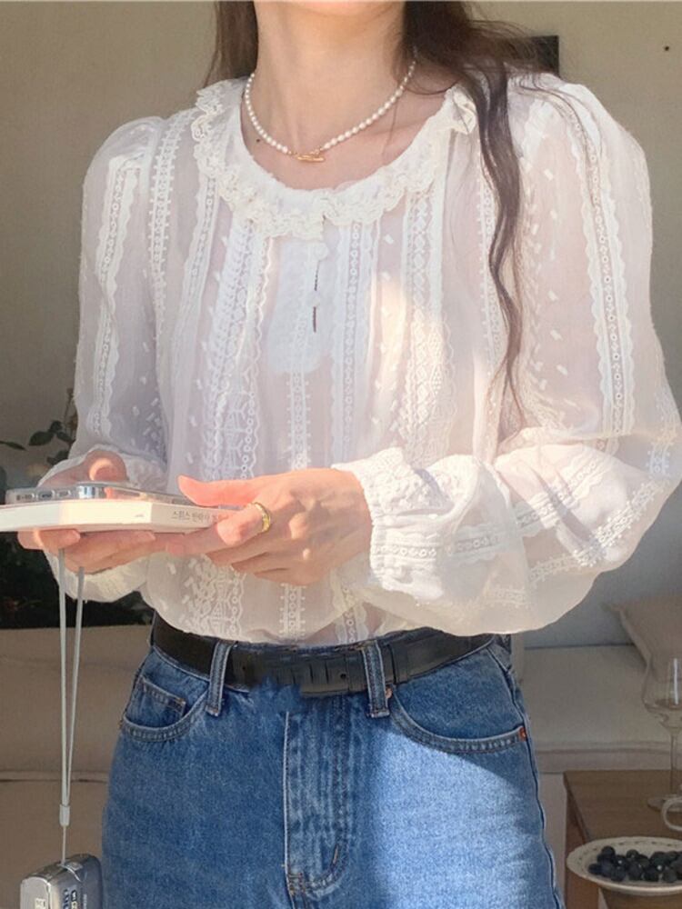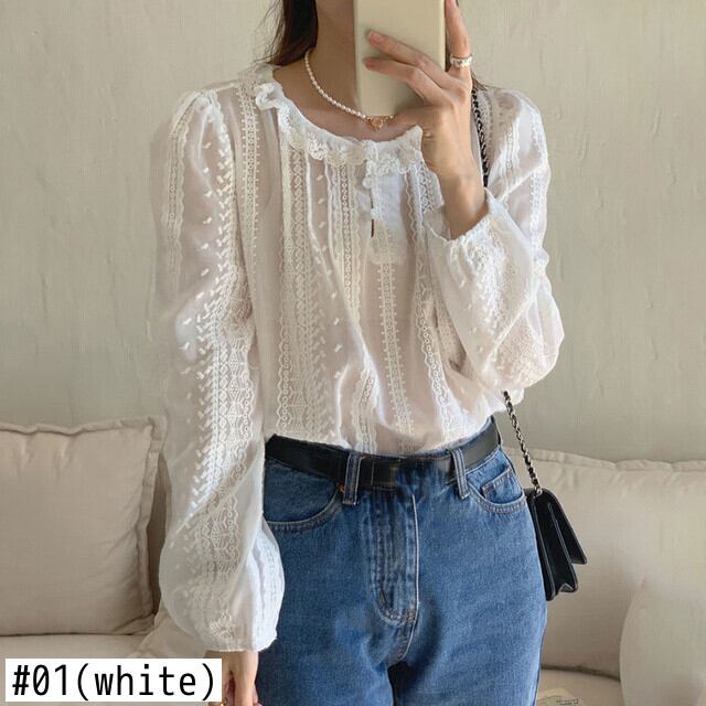[EWQ] O ネック レース中空アウト シャツボタン フリル スプライシング トップ春秋スウィート シャツ 6Y6705 大人ガーリー キュート カジュアル スプリング 春物 オータム 秋物 Oネック