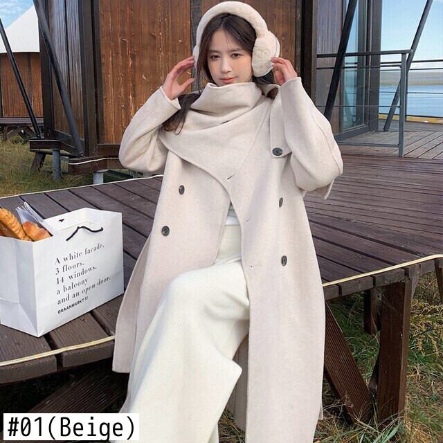 [EWQ] 多彩シックウールコート春秋スカーフ襟レースアップ ウエスト ウール アウター トップス スプリング 春物 オータム 秋物