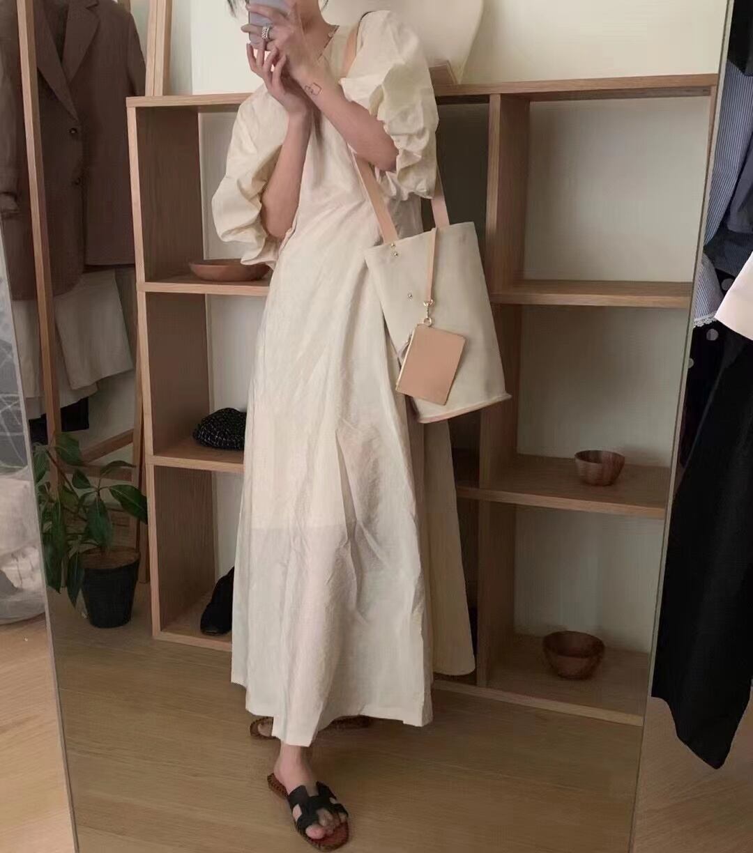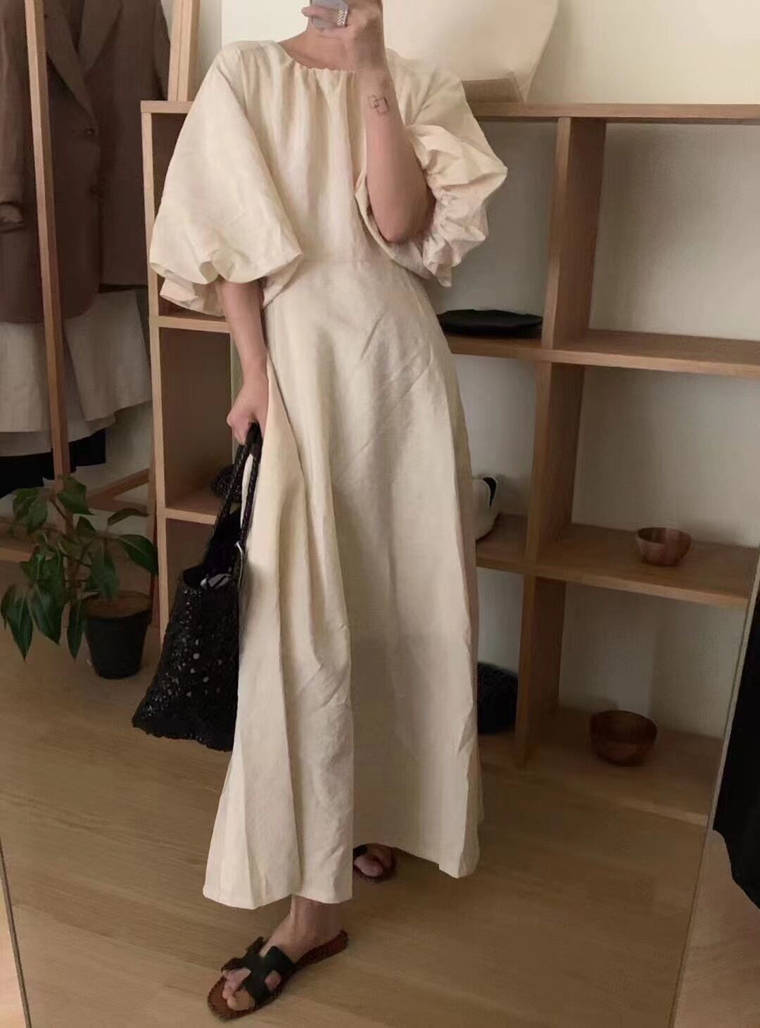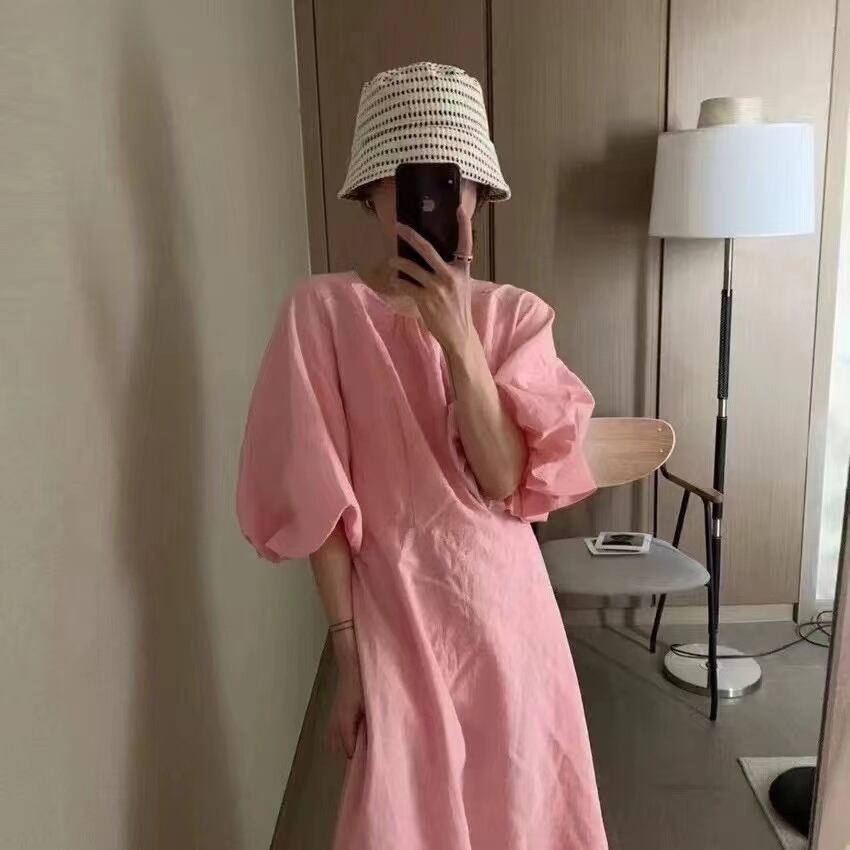 [EWQ] ランタン スリーブ シンプルドレス ピンク O ネック マキシ ドレス夏 Vestidos 16Y8099 ランタンスリーブ サマー 夏物 Oネック