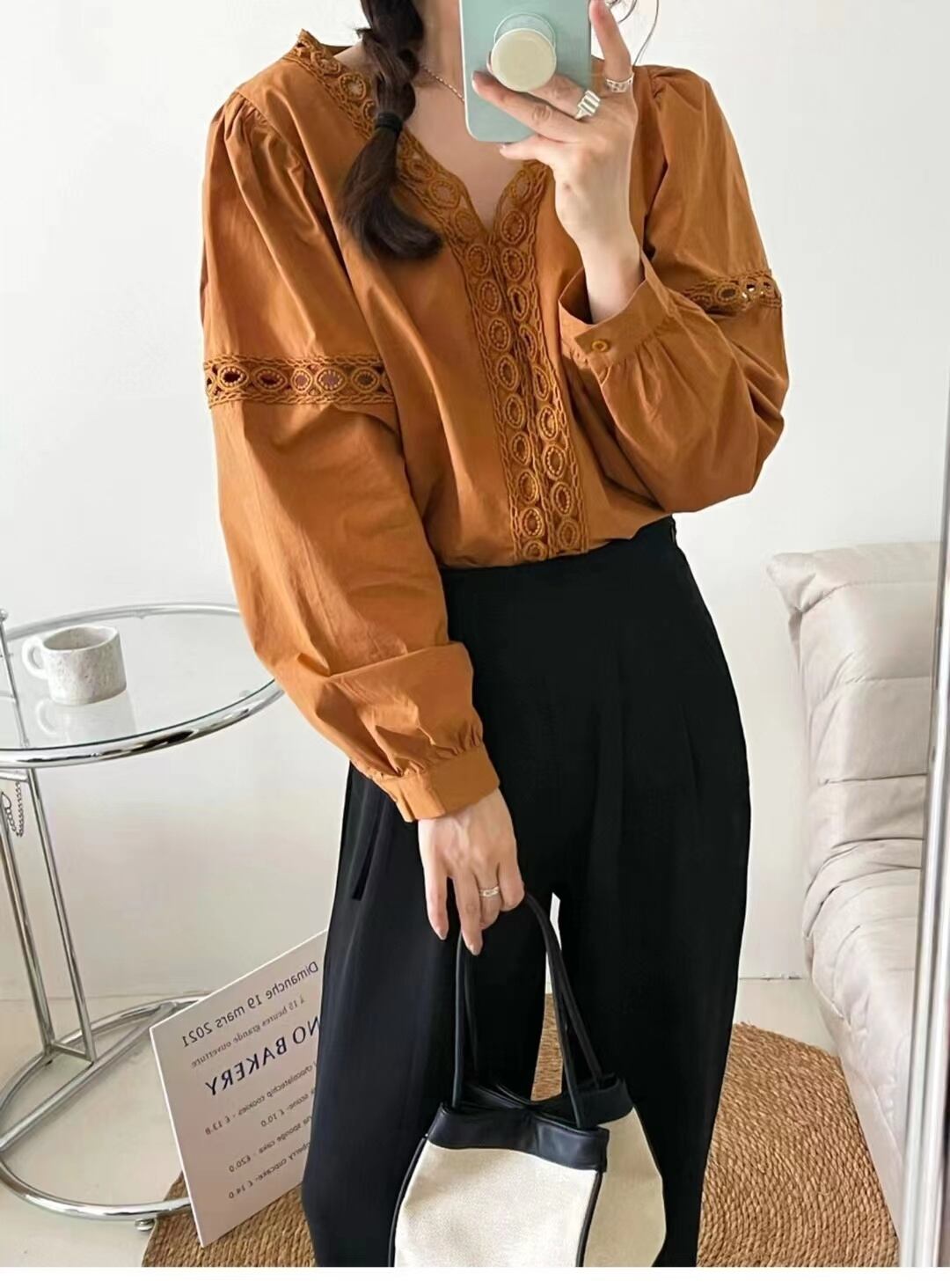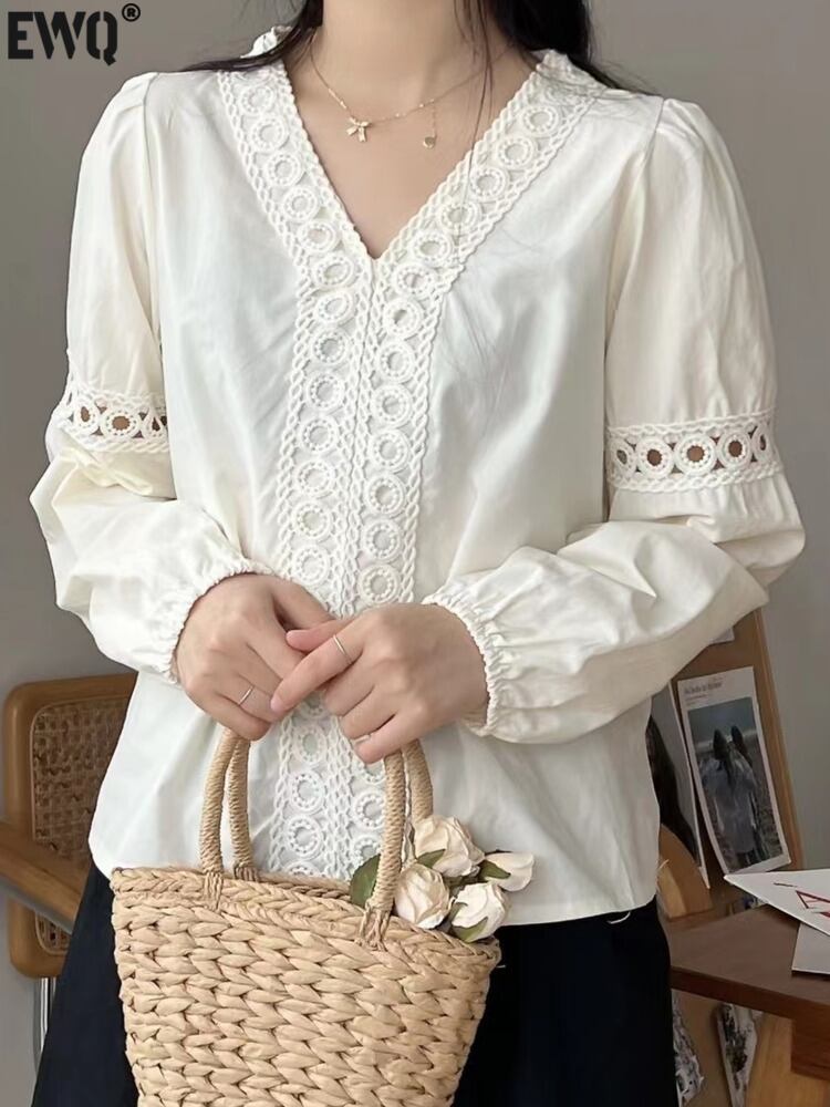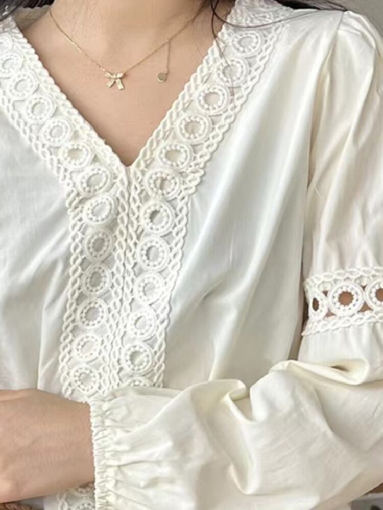 [EWQ] V ネック フック花中空シャツ無地シンプルトップ春秋ルーズ シャツ トップス Y7076 スプリング 春物 オータム 秋物 Vネック ソリッドカラー フラワーデザイン
