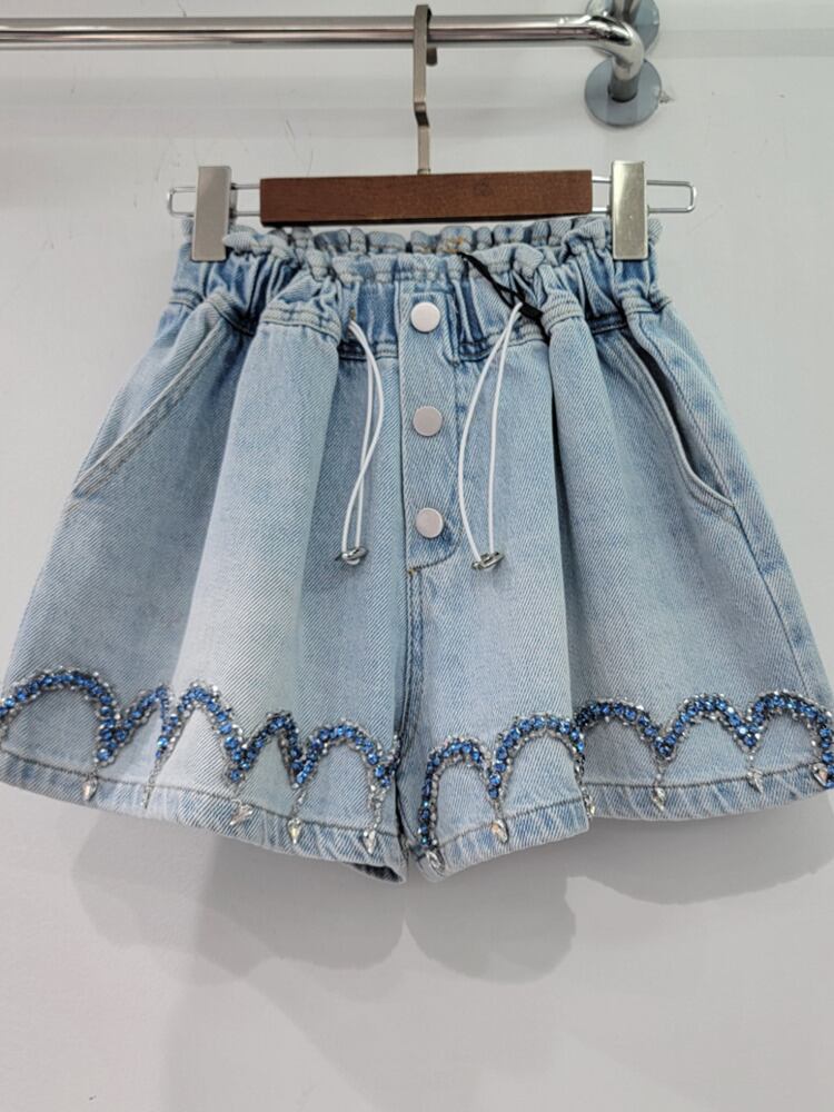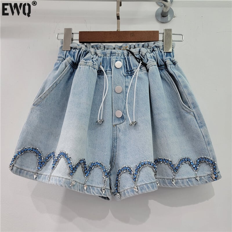 [EWQ] ビーズ ウエスト ワイドレッグ デニム ショーツ プリーツ巾着ポケット ストリート ショート パンツ夏潮 6Y7709 サマー 夏物 ブルマー ワイドパンツ