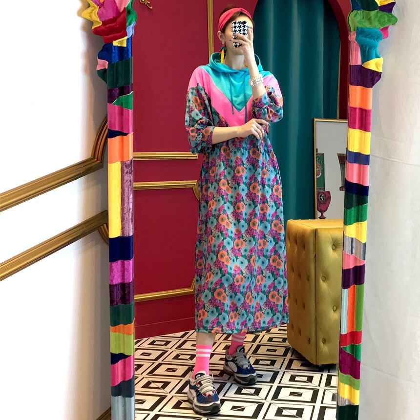 [EWQ] フード付きコントラストフラワードレス春パッチワークロングドレスシックハーフランタンスリーブ Vestido 1865 スプリング 春物 フラワーデザイン
