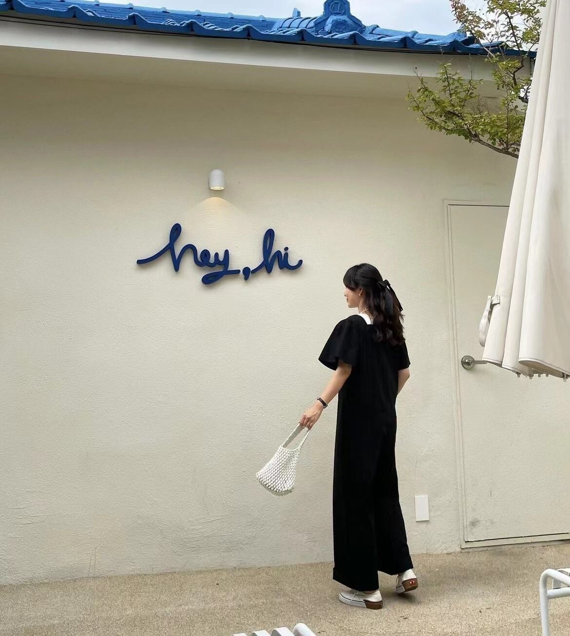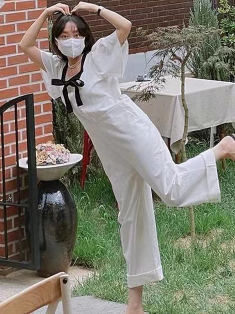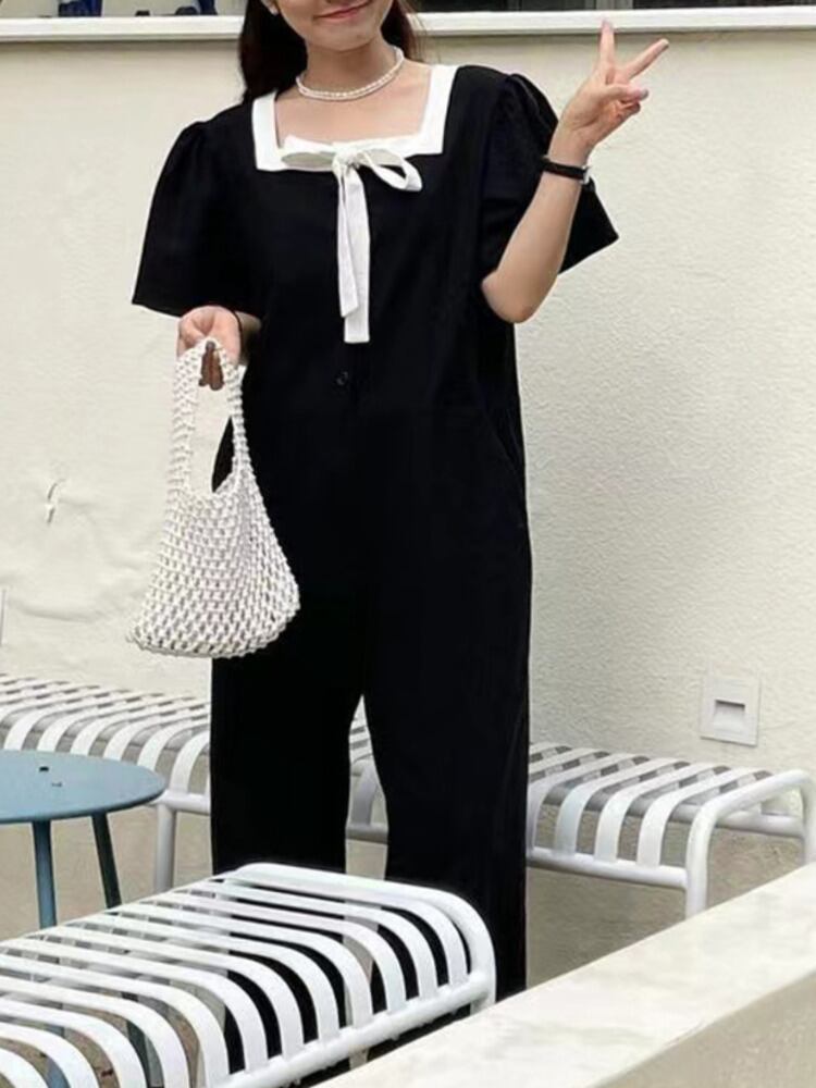[EWQ] スクエアネックコントラストレースアップボウジャンプスーツパフスリーブワイドレッグジャンプスーツ春秋オールマッチ服 61 リボン スプリング 春物 オータム 秋物 ワイドパンツ スクウェア