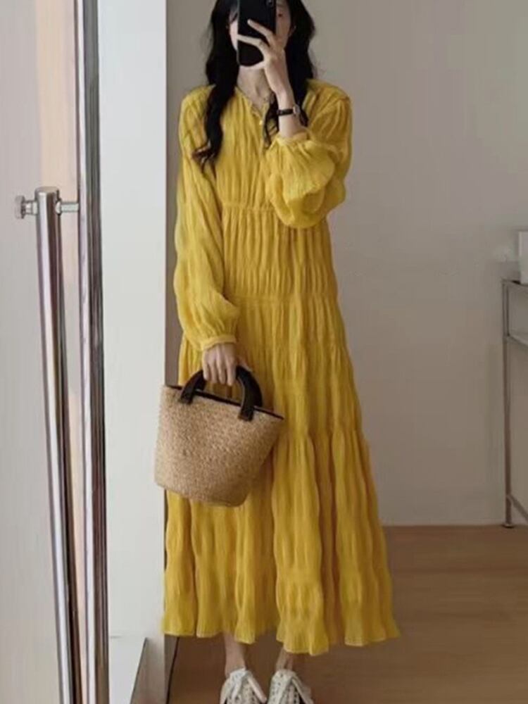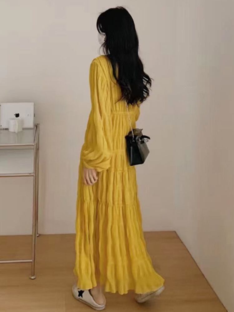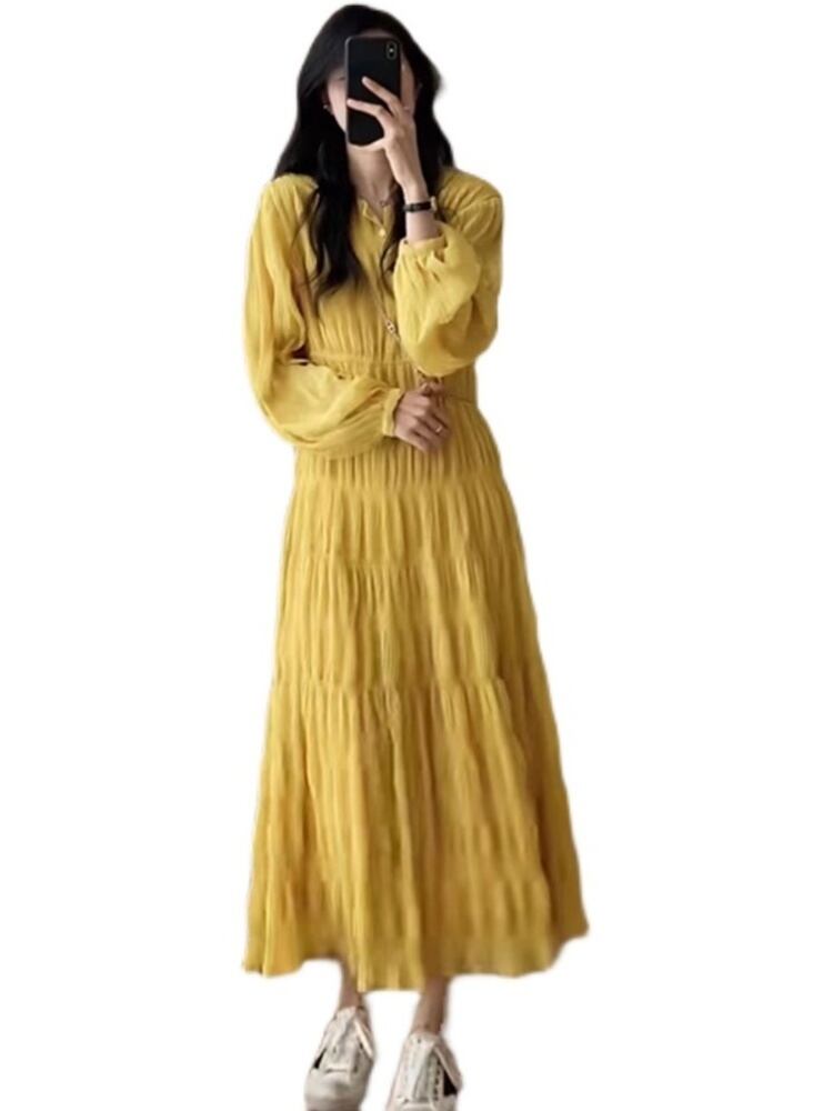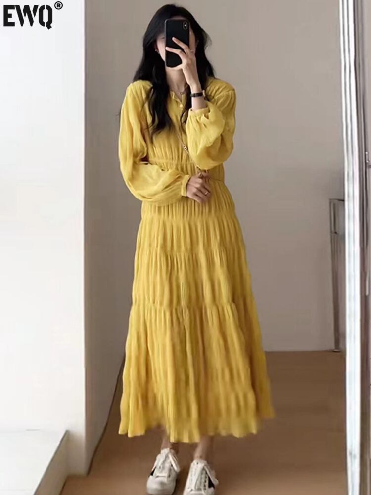 [EWQ] シックプリーツ ウエスト ドレス無地長袖マキシ シフォン ドレス春秋ルース Vestido ロング スプリング 春物 オータム 秋物 ソリッドカラー
