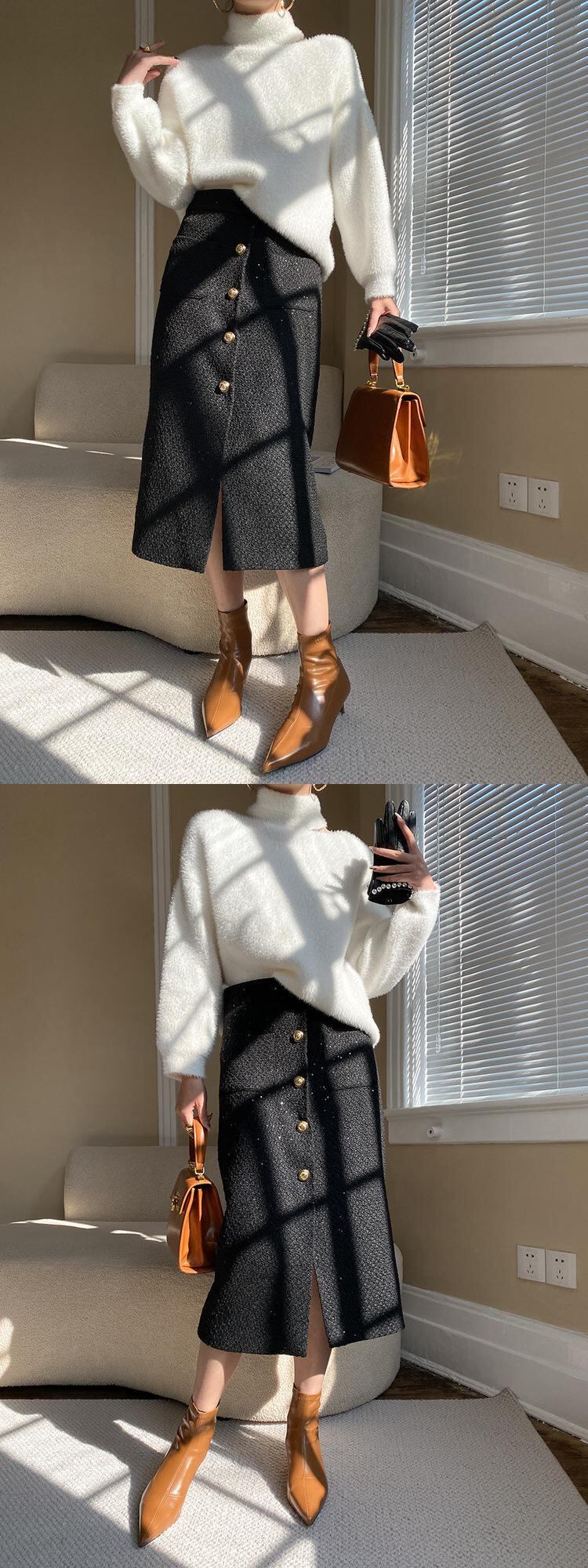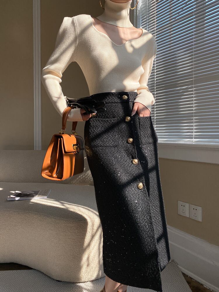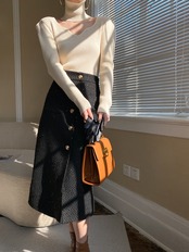 【EWQ】 レディース ウエストスカート 春 冬 シングルブレスト シックスカート ブラック ツイード 16Y5364cc スプリング 春物 ウィンター 冬物