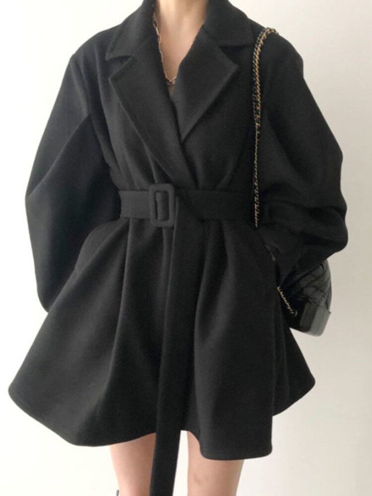 【EWQ】春 冬 ターンダウンカラー ランタンスリーブ ミニマリスト レースアップ ウエスト ウールコート トップス オーバーコート スプリング 春物 ウィンター 冬物