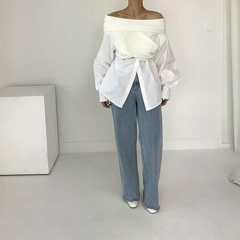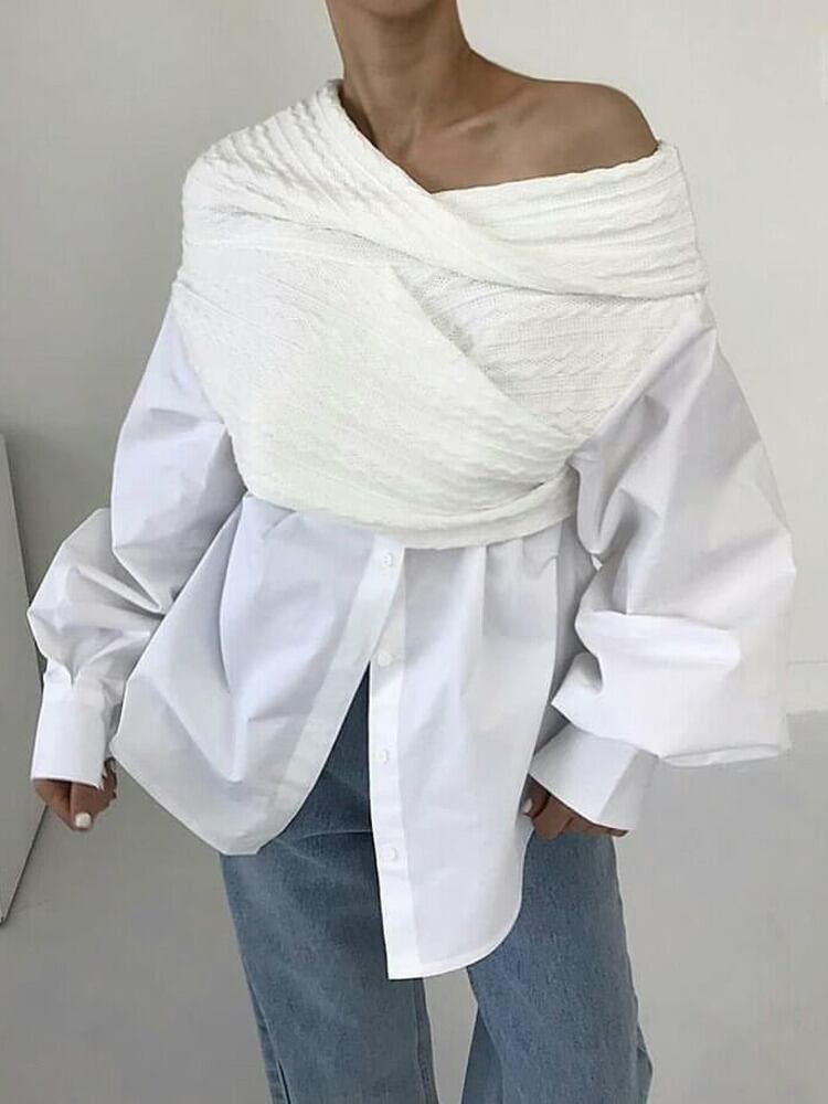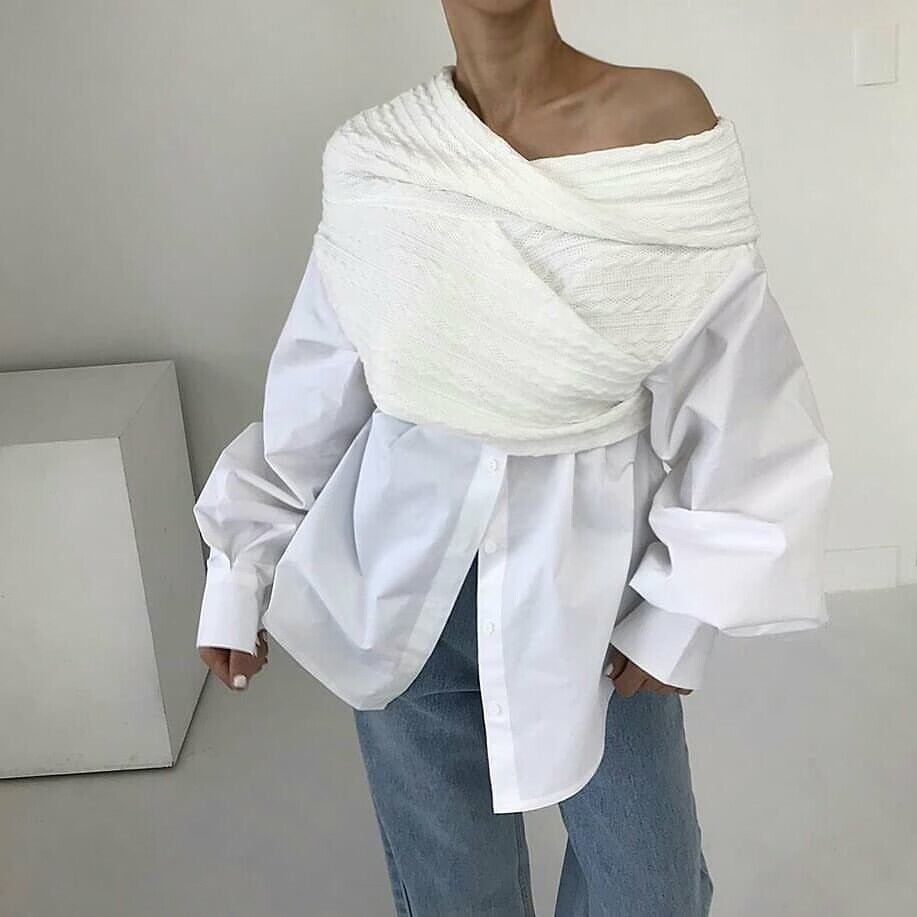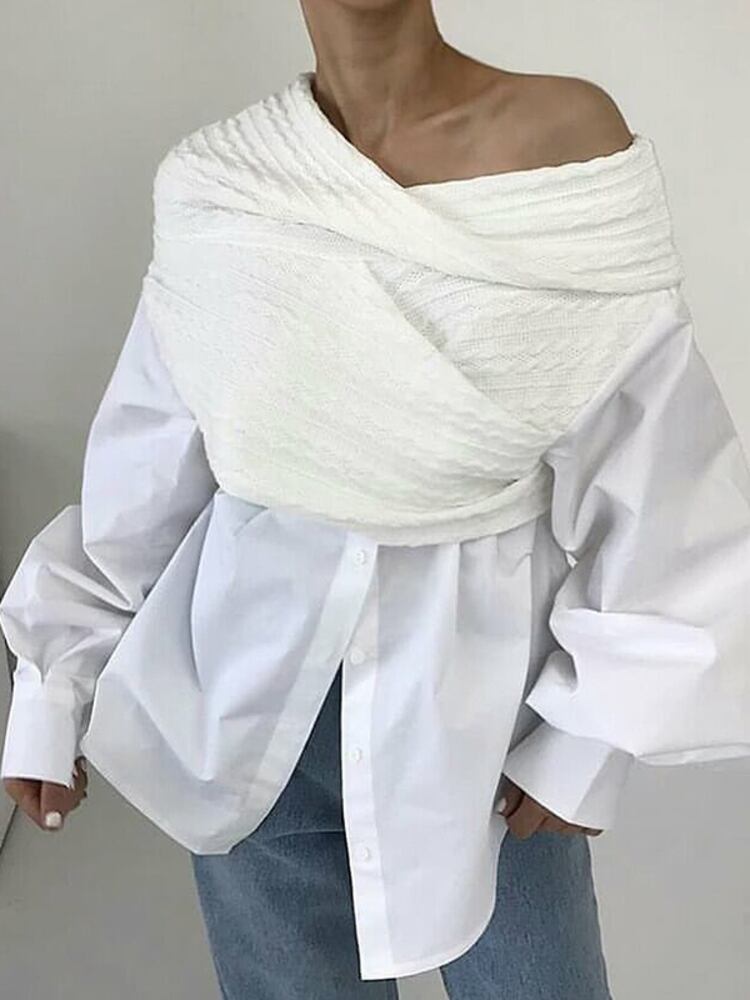 [EWQ] オフショルダー イレギュラー ニット スプライシング シャツ レディース コントラスト ロングスリーブ トップ 春 秋 シャツ 16Y6687 長袖 スプリング 春物 オータム 秋物