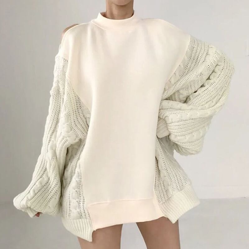 [EWQ] ハーフカラー中空オフショルダースプライスニットセーター春ゆったり長袖シックプルオーバートップス ロング スプリング 春物