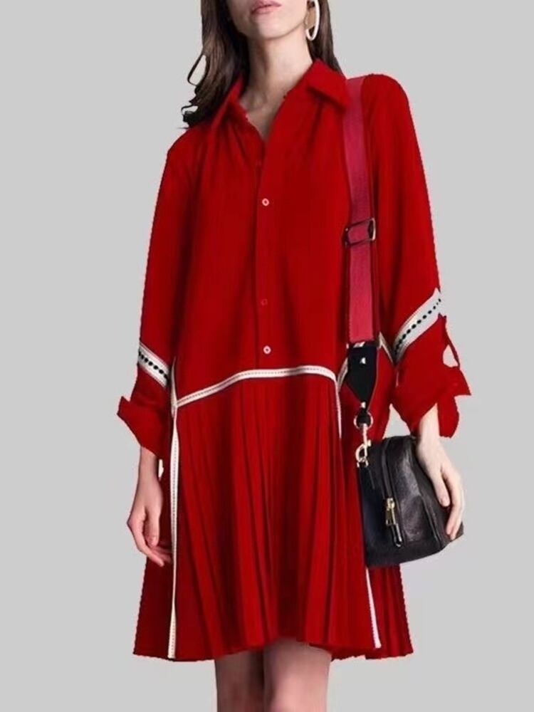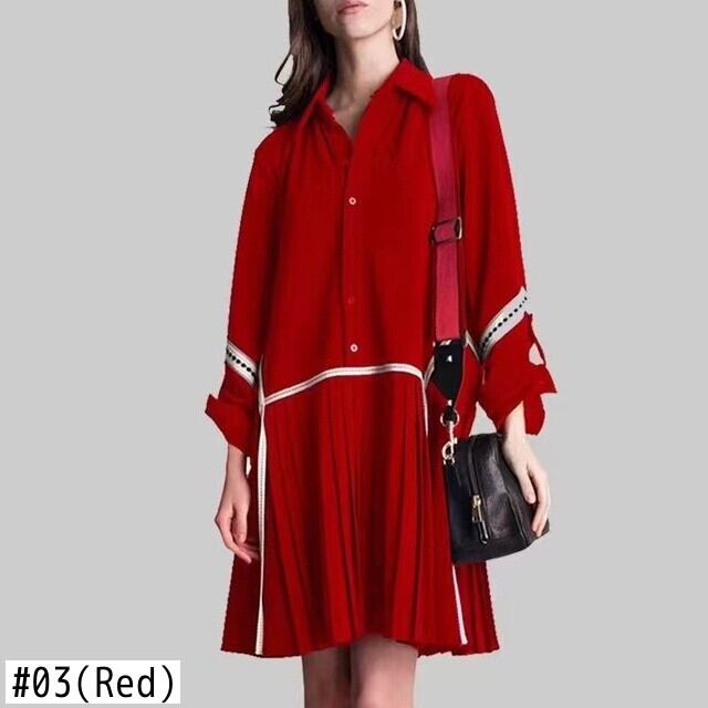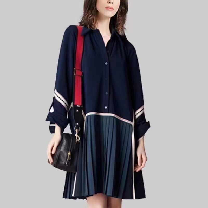 【EWQ】コントラストカラープリーツスプライスワンピ シックボタンパッチワーク ロングスリーブミニワンピ サマーベスティド 長袖 夏物 ドレス