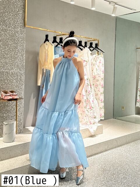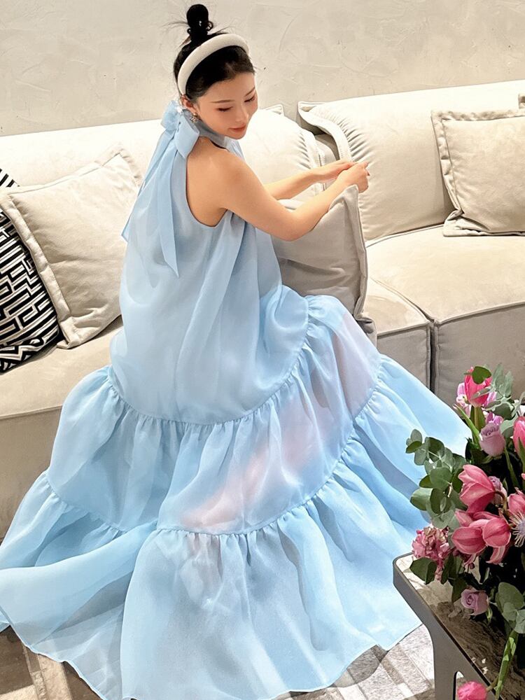 [EWQ] ホルター ボウ ノースリーブ ホリデー ドレス フリル スプライシング無地マキシ ドレス夏潮 Vestido 8060 リボン サマー 夏物 ソリッドカラー
