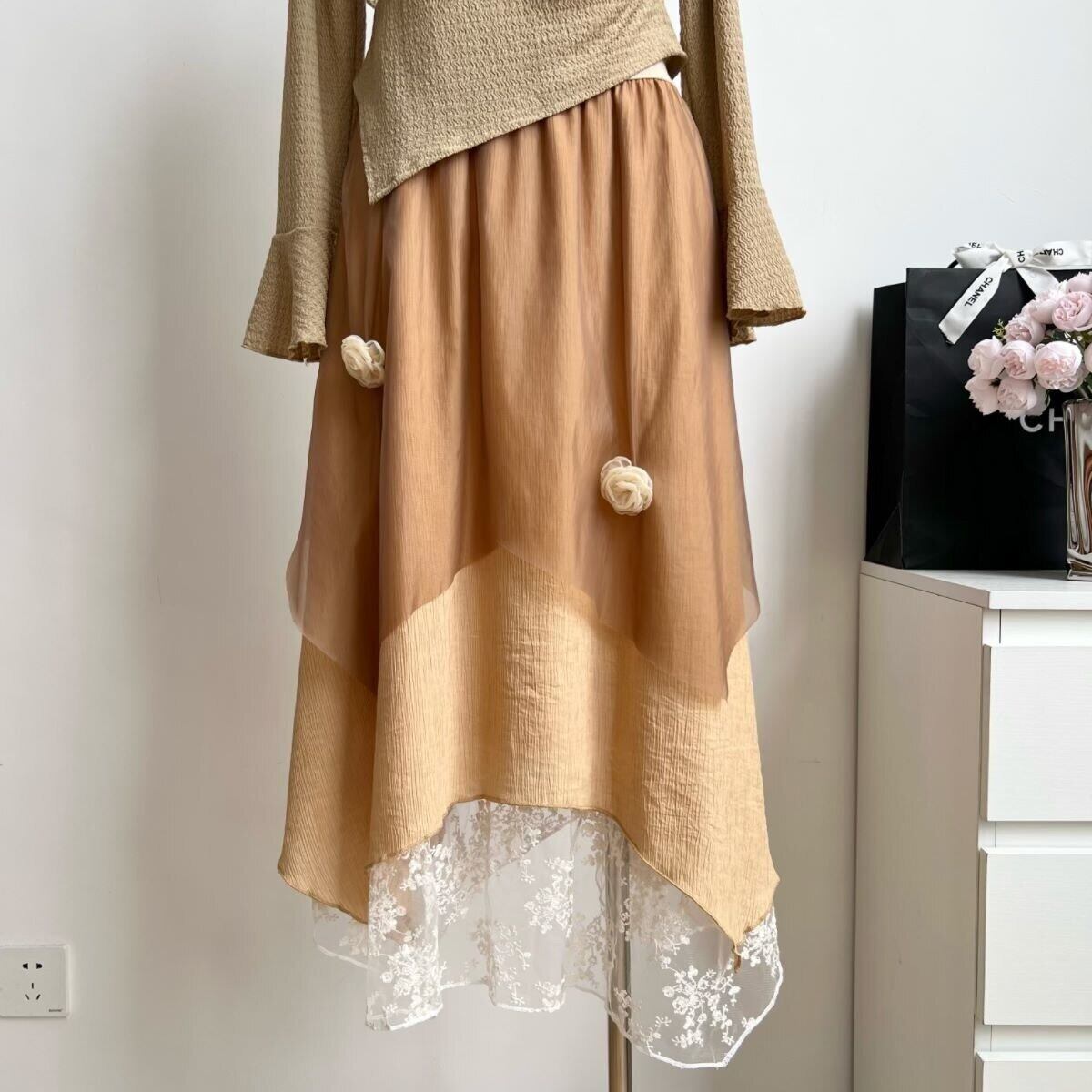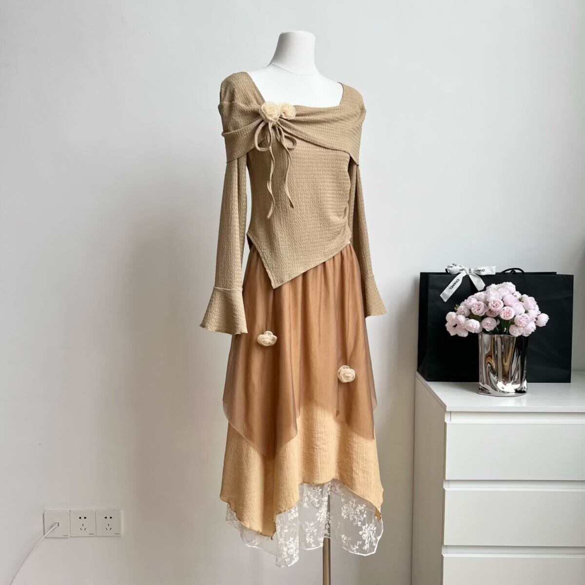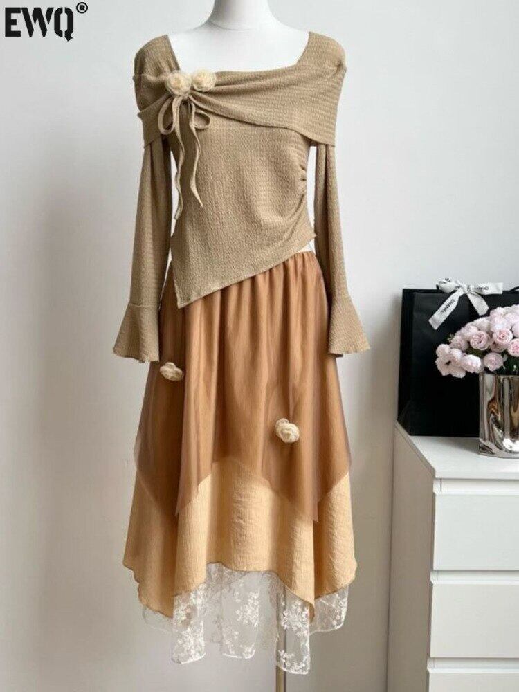 [EWQ] 3D フラワー スラッシュ ネック Tシャツ + レース スプライシング コントラスト Aライン スカート セット サマー ツーピース スーツ 夏物 フラワーデザイン