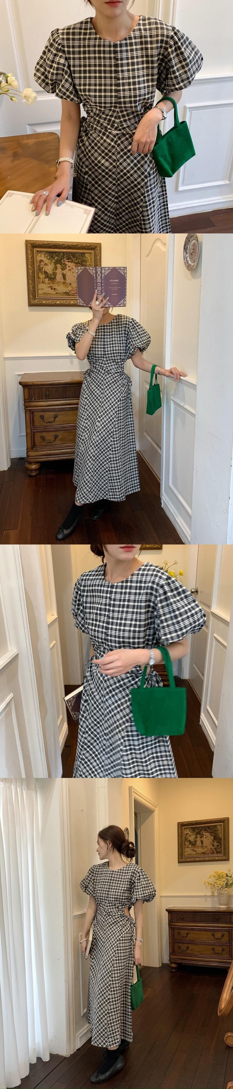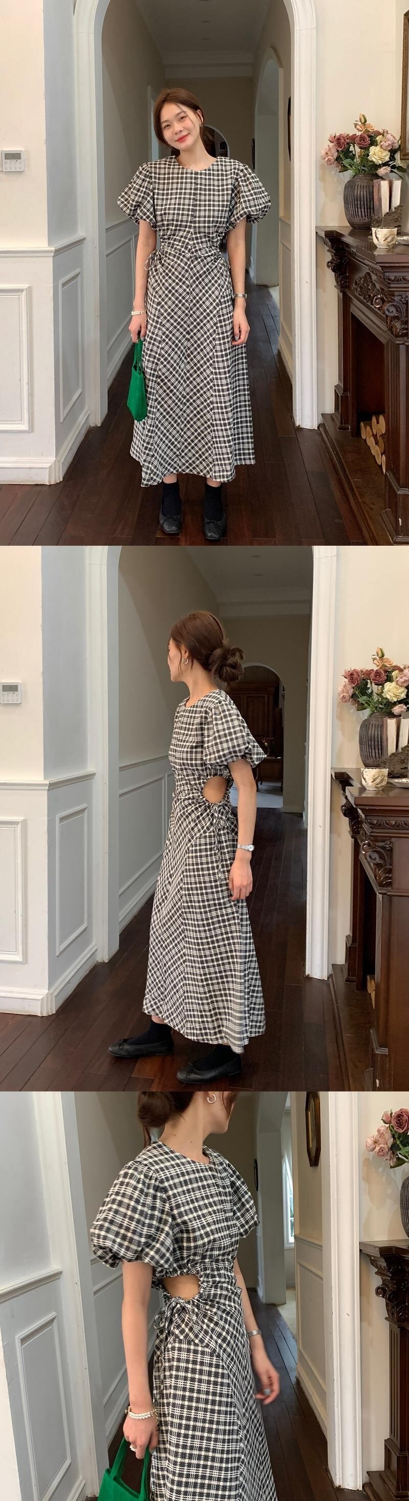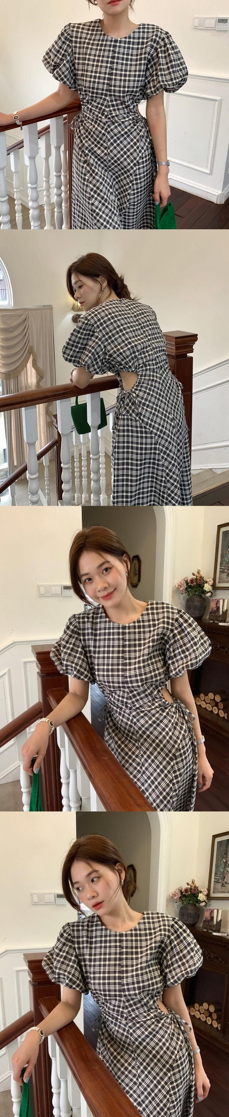 [EWQ] チェック柄中空アウト巾着ドレス O ネック コントラスト カラー パフ スリーブ ドレス夏潮 Rode 16Y7540 サマー 夏物 Oネック