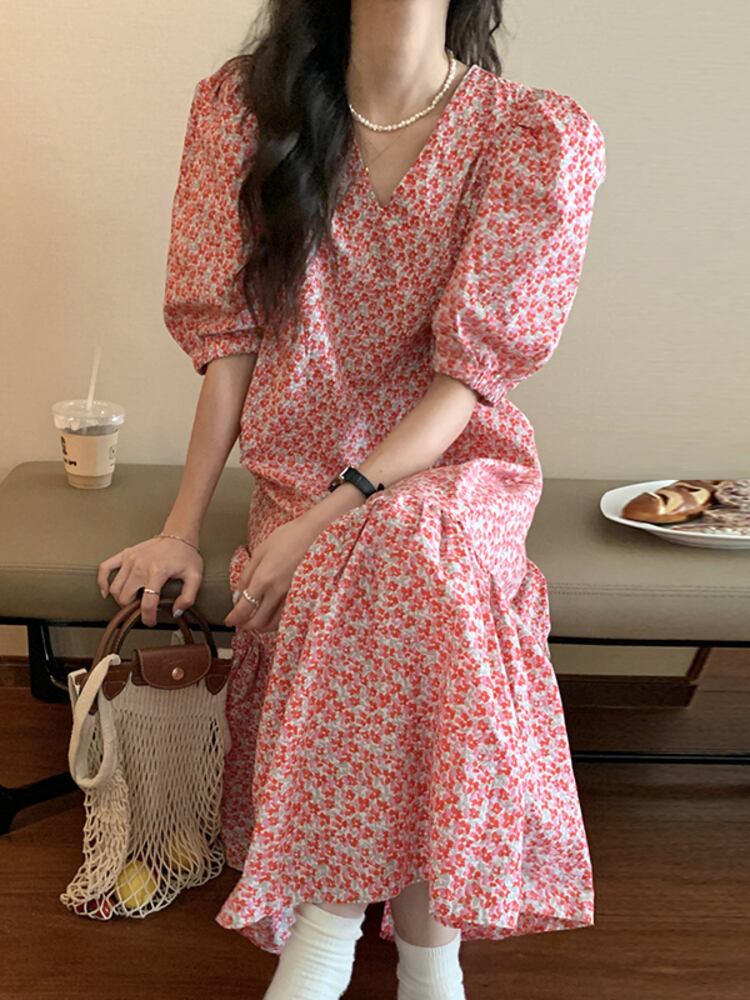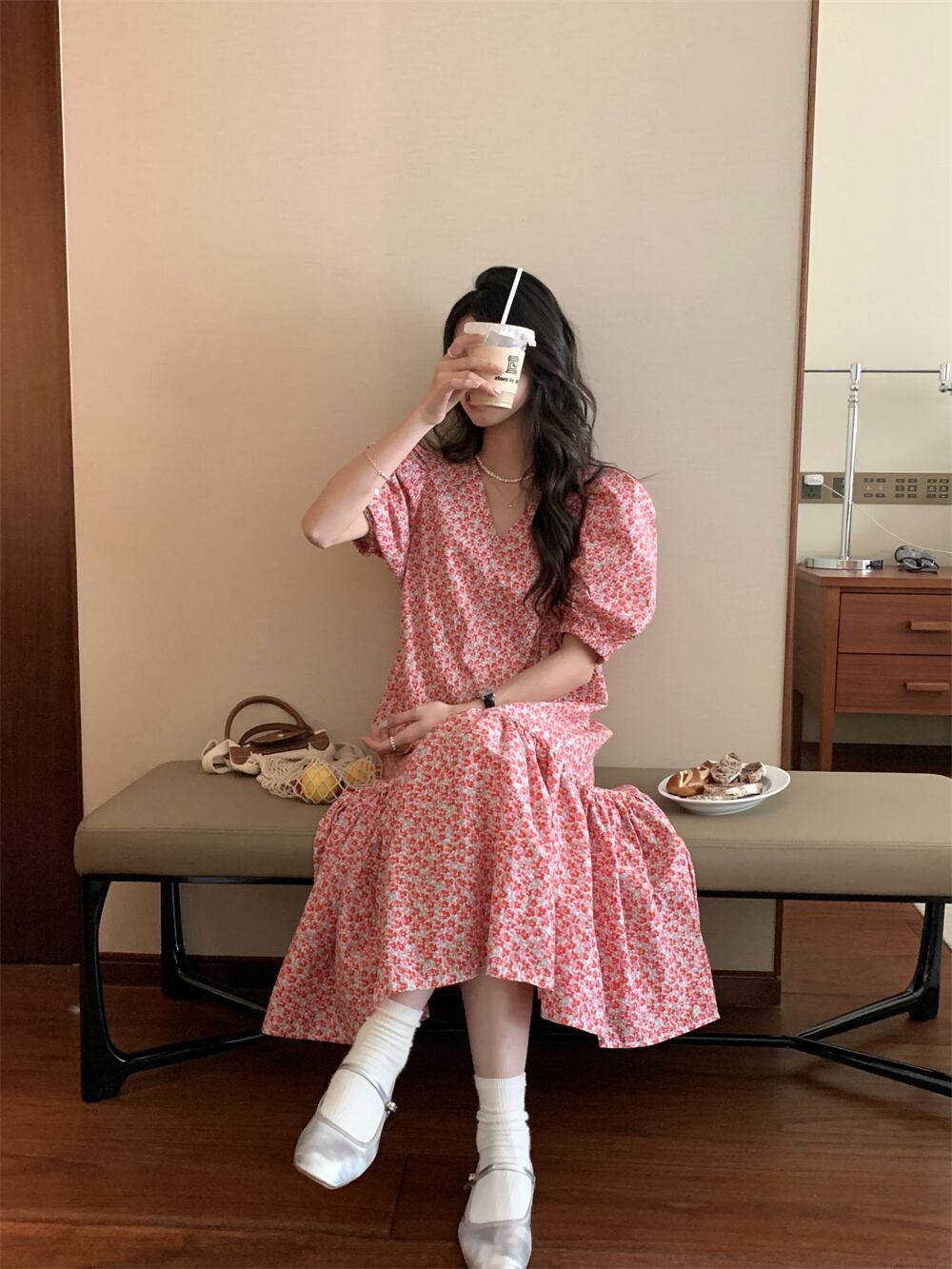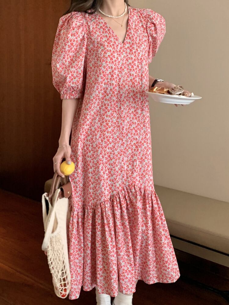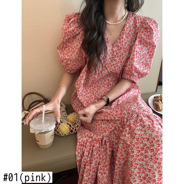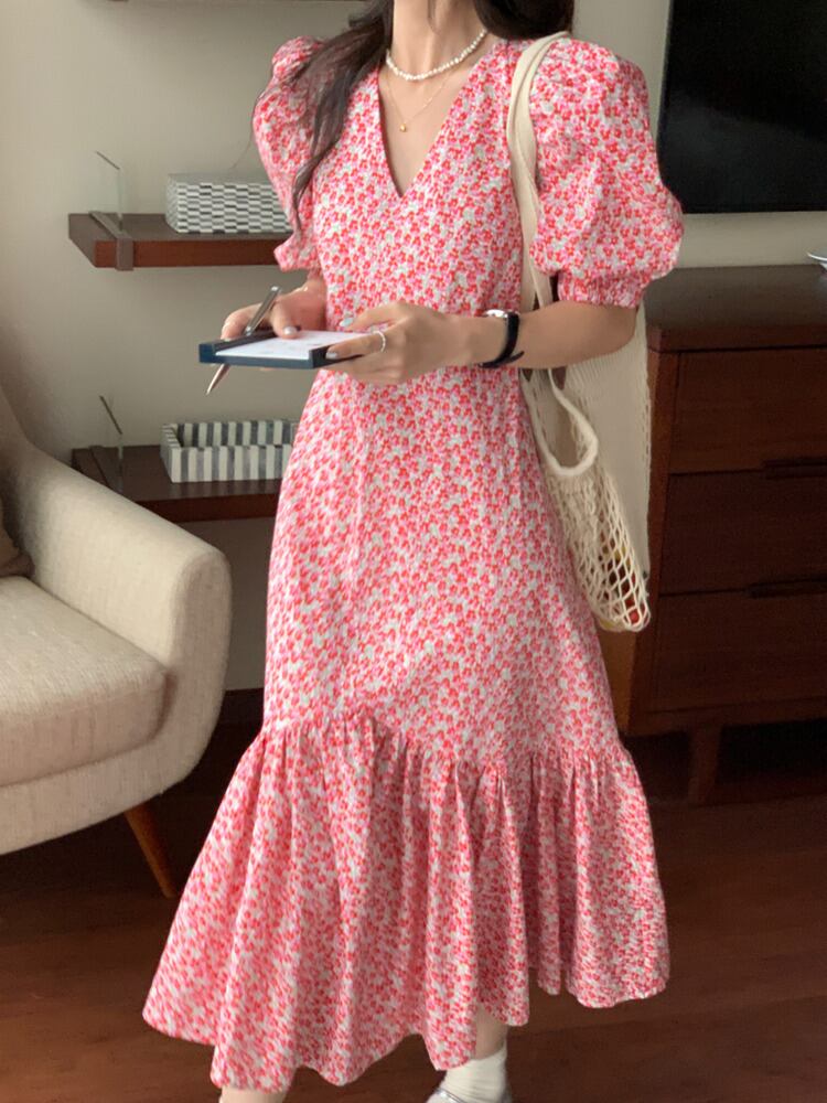 [EWQ] V ネック プリント コントラスト ドレス ピンク パフ スリーブ フリル スプライシング プリーツ ルーズ ドレス夏潮 Vestido Y8410 サマー 夏物 Vネック