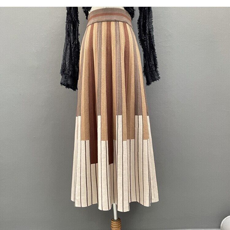 【EWQ】カラーコントラストニットスカート レディース ウエストゴム ふんわりストライプ Aライン ニットスカート 春 秋 ファルダス37 エラスティック 伸縮 スプリング 春物 オータム 秋物