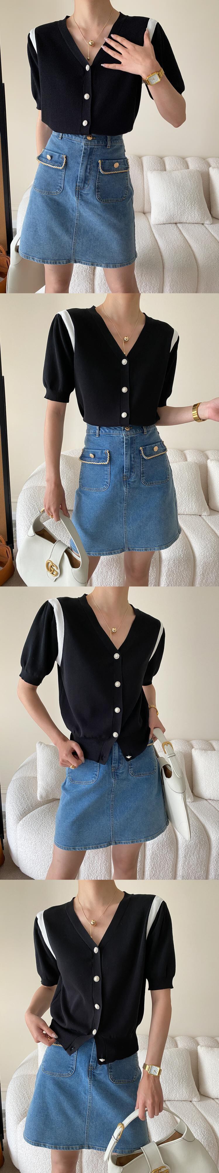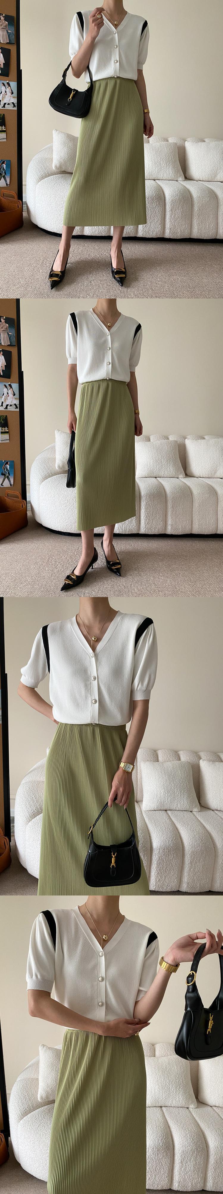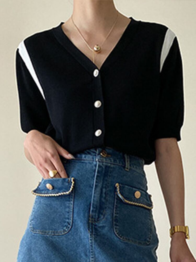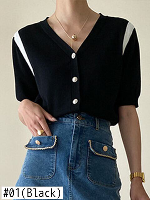 [EWQ] レディース コントラスト パール ボタン ニット Tシャツ シングル ブレスト カジュアル ランタン スリーブ ニット Tシャツ トップス サマー タイド トップス ランタンスリーブ 夏物 真珠