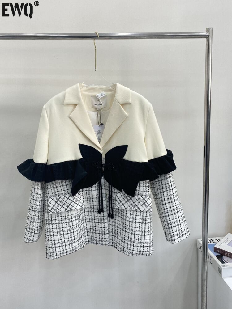 [EWQ] パッチワーク長袖ブレザーコート弓真珠スプライスチェック柄コントラストカラースーツジャケット春秋 ロング リボン スプリング 春物 オータム 秋物 パール
