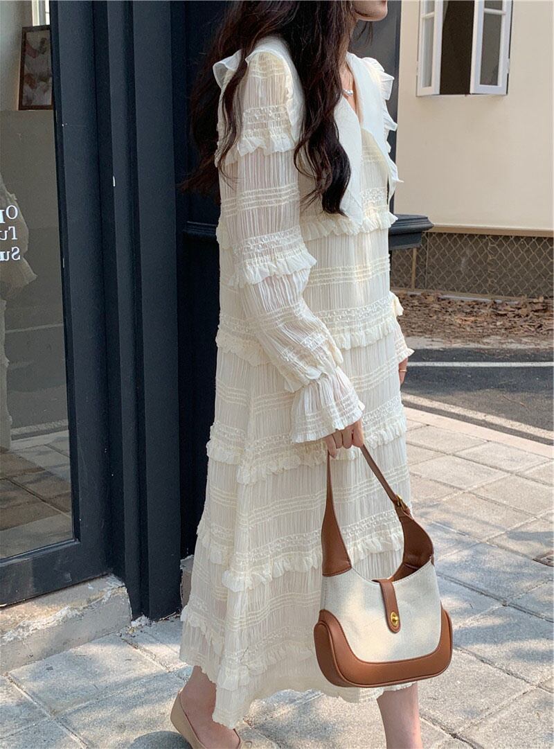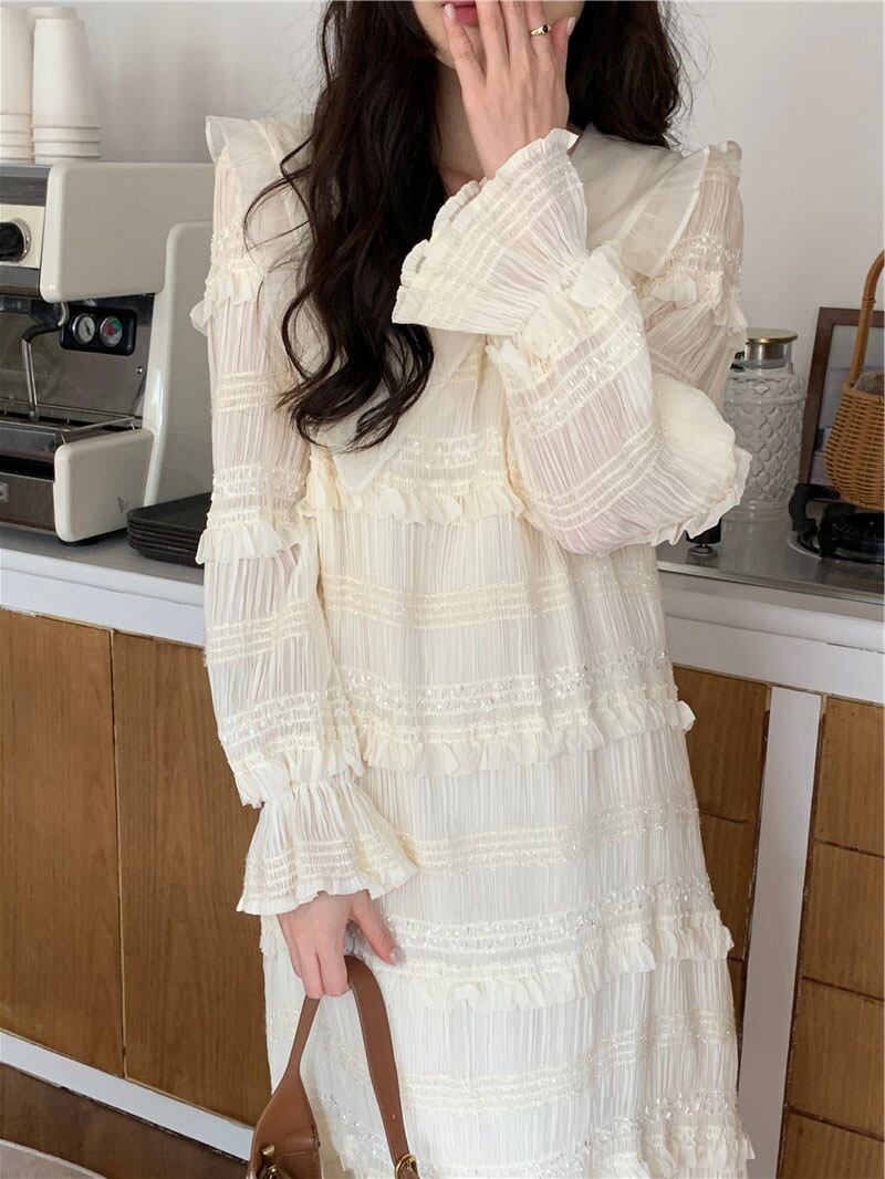 【EWQ】長袖 ピーターパンカラー スイート アンド ローブ キレイめ レディース プリーツ フリルワンピース キレイめ 春 ロング 大人ガーリー スウィート キュート カジュアル スプリング 春物