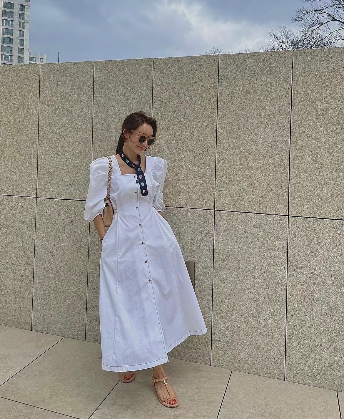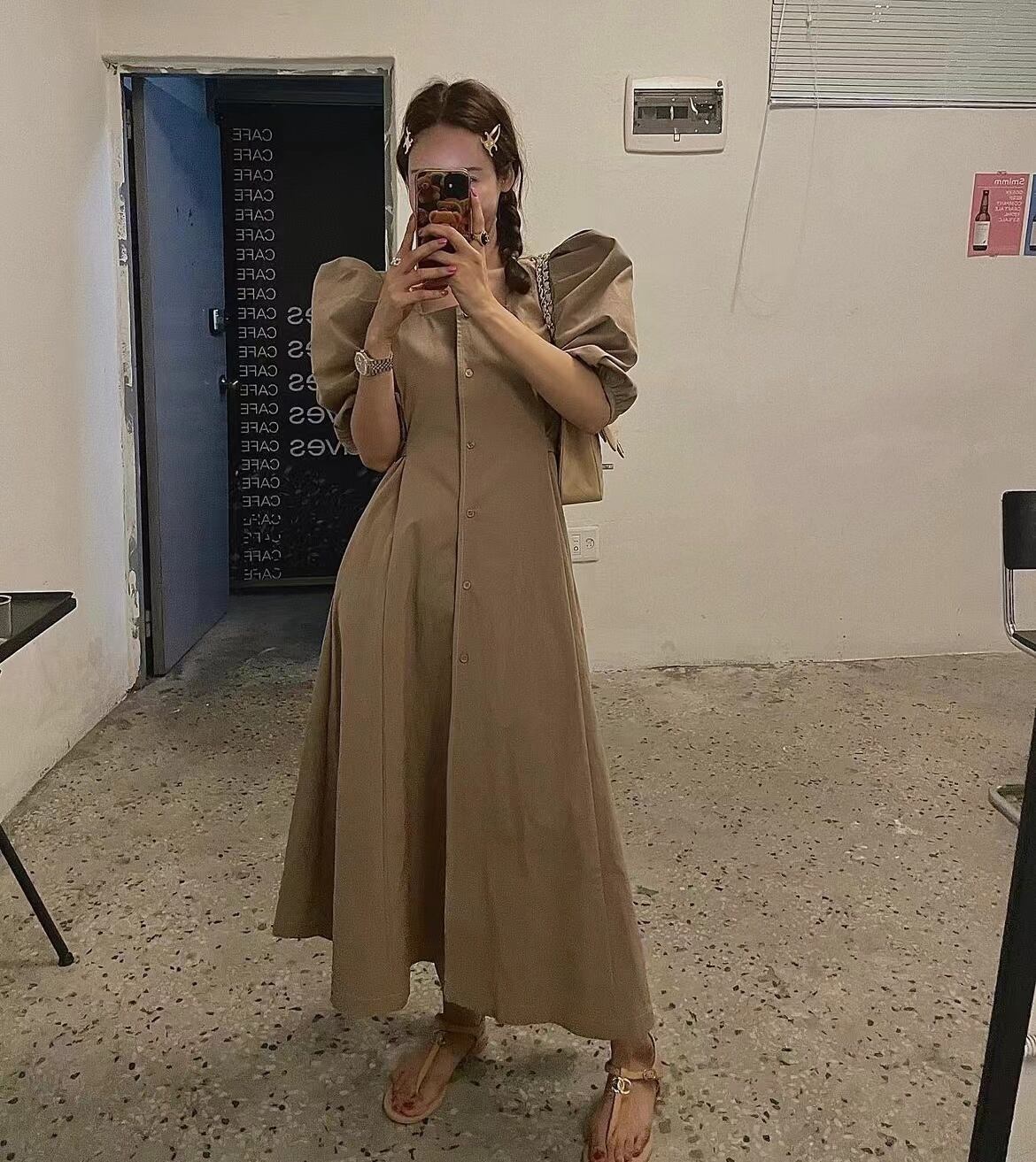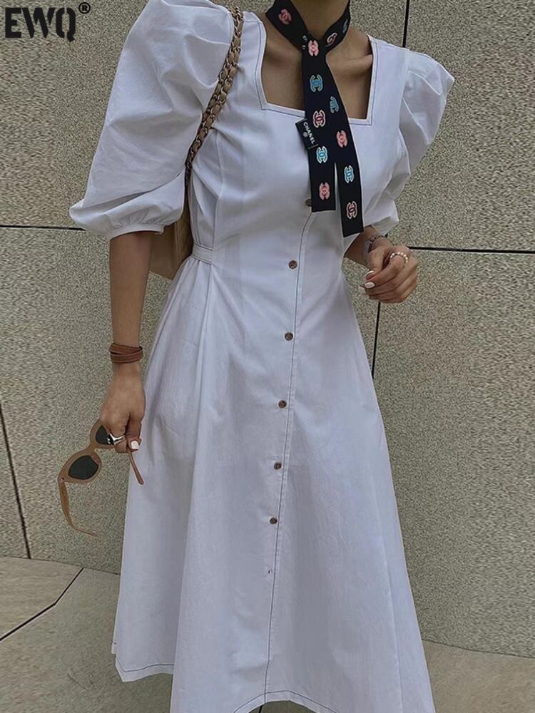 [EWQ] スクエア ネック レース アップ ドレス シングル ブレスト無地バブル スリーブ マキシ ドレス夏 Vestido 93 サマー 夏物 レースアップ ソリッドカラー スクウェア