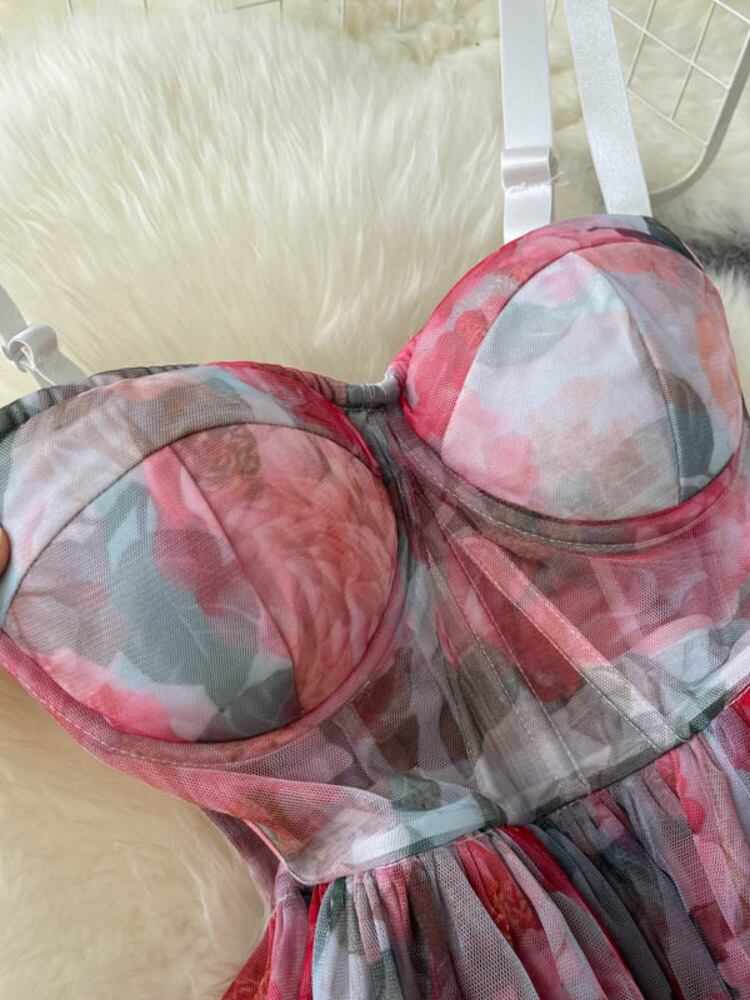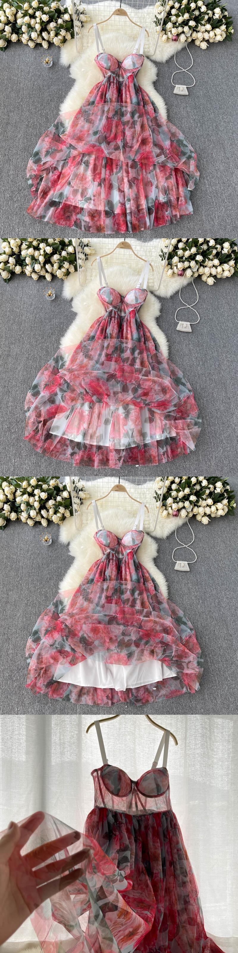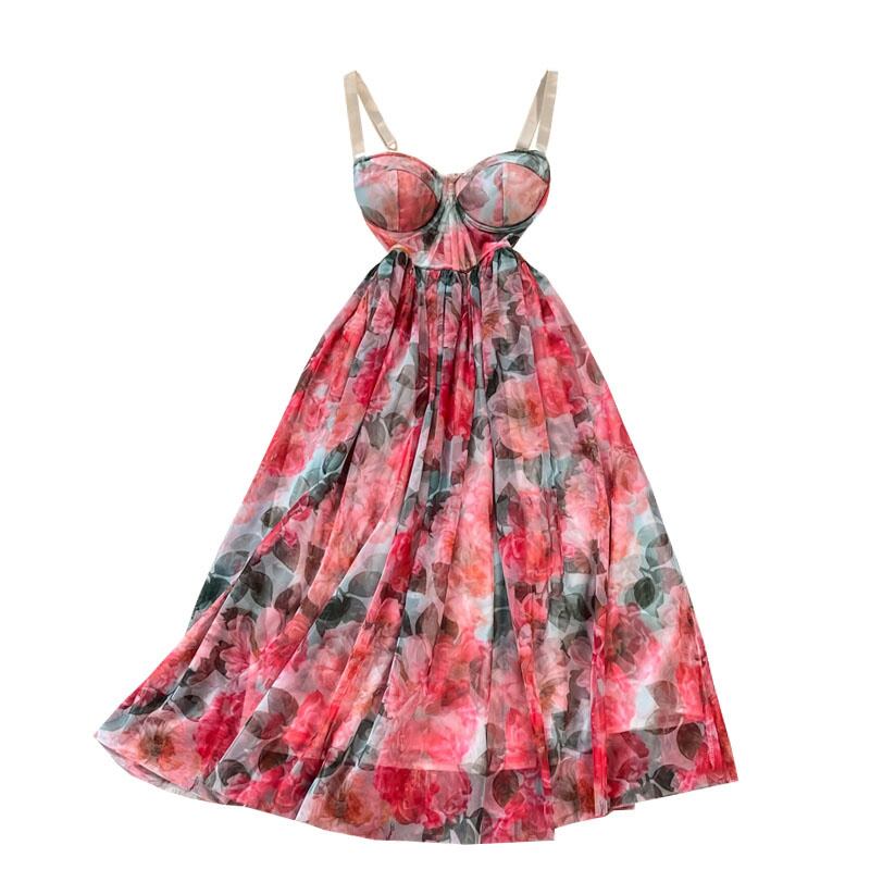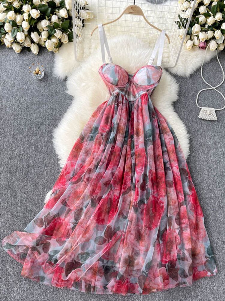 [EWQ] 気質スリング ドレス夏プリント V ネック セクシーコルセット ミディ ストラップ ドレス Vestidos 6Y7931 サマー 夏物 Vネック