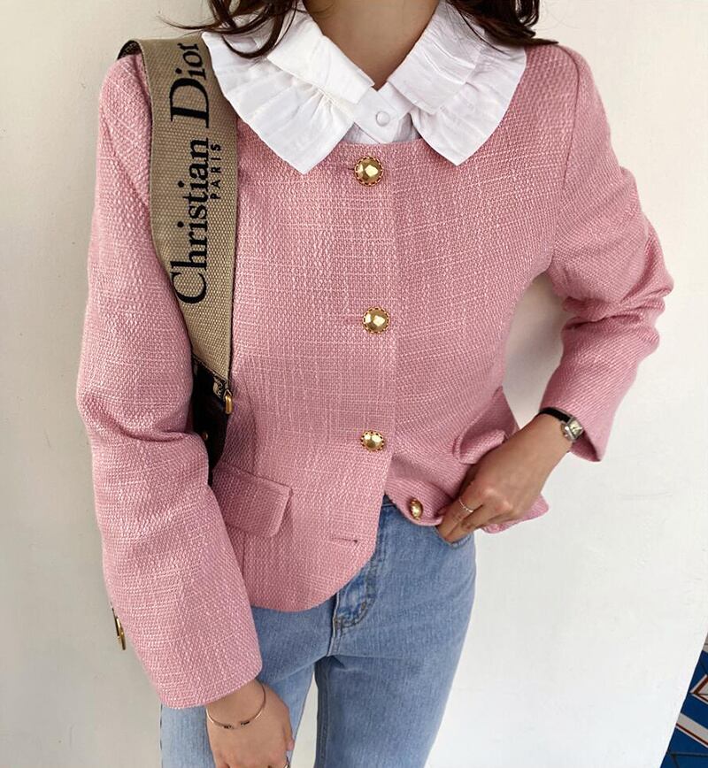 [EWQ] シングル ブレスト ピンク ツイード ウール ジャケット長袖ソリッド ウール ブレンド ジャケット コート春秋 12 ロング スプリング 春物 オータム 秋物 ソリッドカラー