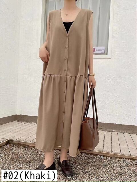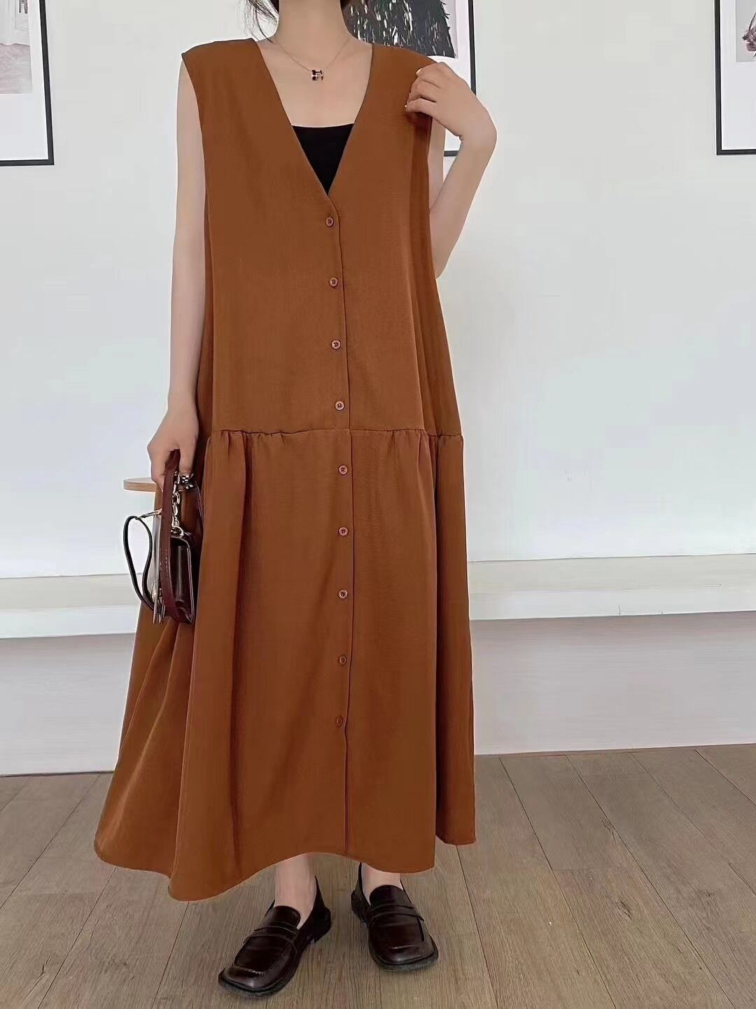 [EWQ] シングル ブレスト ルーズ ベスト ドレスプリーツ スプライシング ノースリーブ V ネック ドレス夏 Rode 16Y7629 サマー 夏物 Vネック