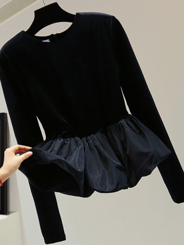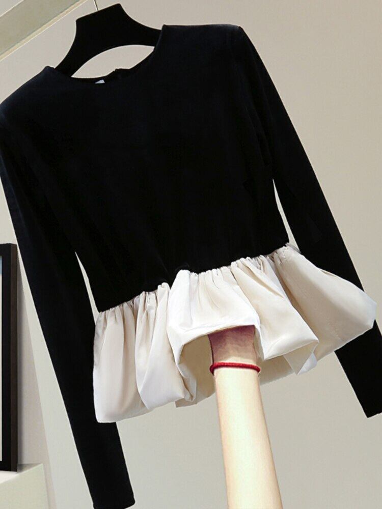 [EWQ] スプライス フリル レディース スウィート 長袖 トップス 春 Oネック シック シンプル ロング ラッフル 大人ガーリー キュート カジュアル スプリング 春物
