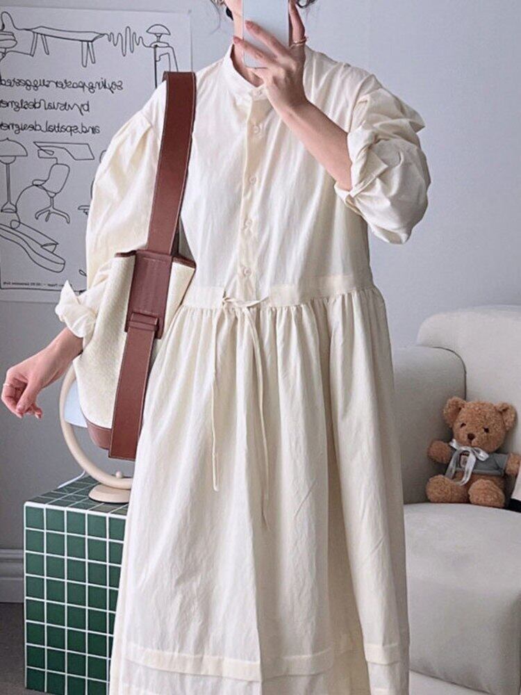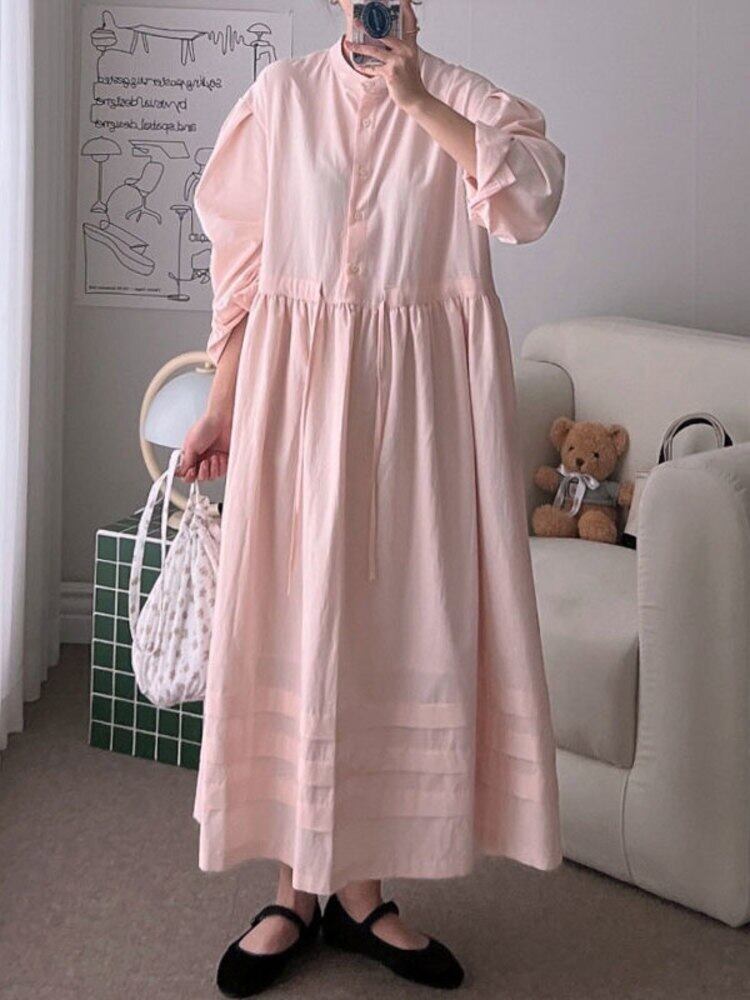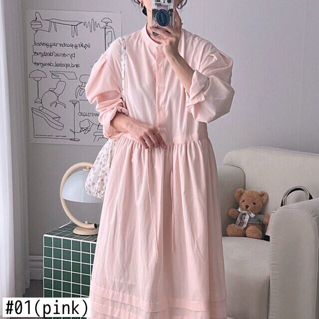 [EWQ] スタンドネックレースアップドレスプリーツウエスト A ラインマキシドレス春秋シックピンク Vestido Y6701 スプリング 春物 オータム 秋物 Aライン