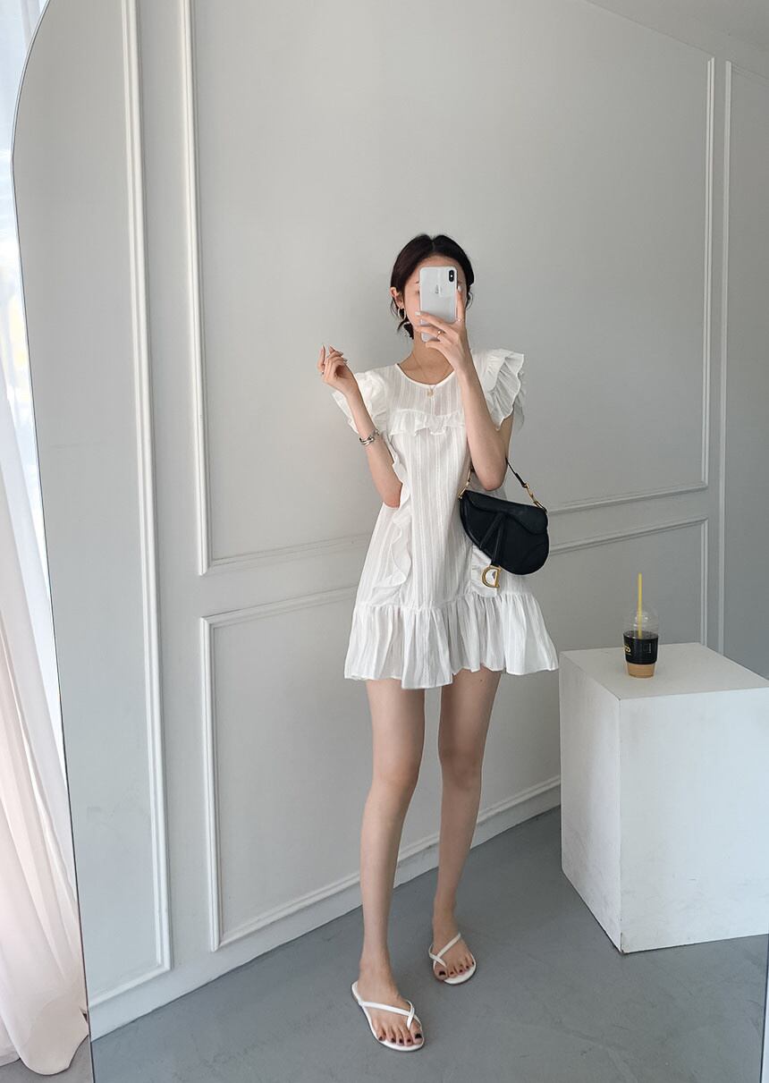 [EWQ] フリルスプライスフライングスリーブミニドレスルーズ O ネック無地ドレス夏できる Vestido サマー 夏物 Oネック ソリッドカラー