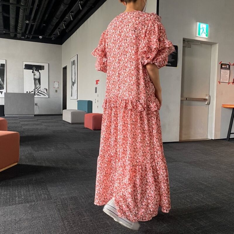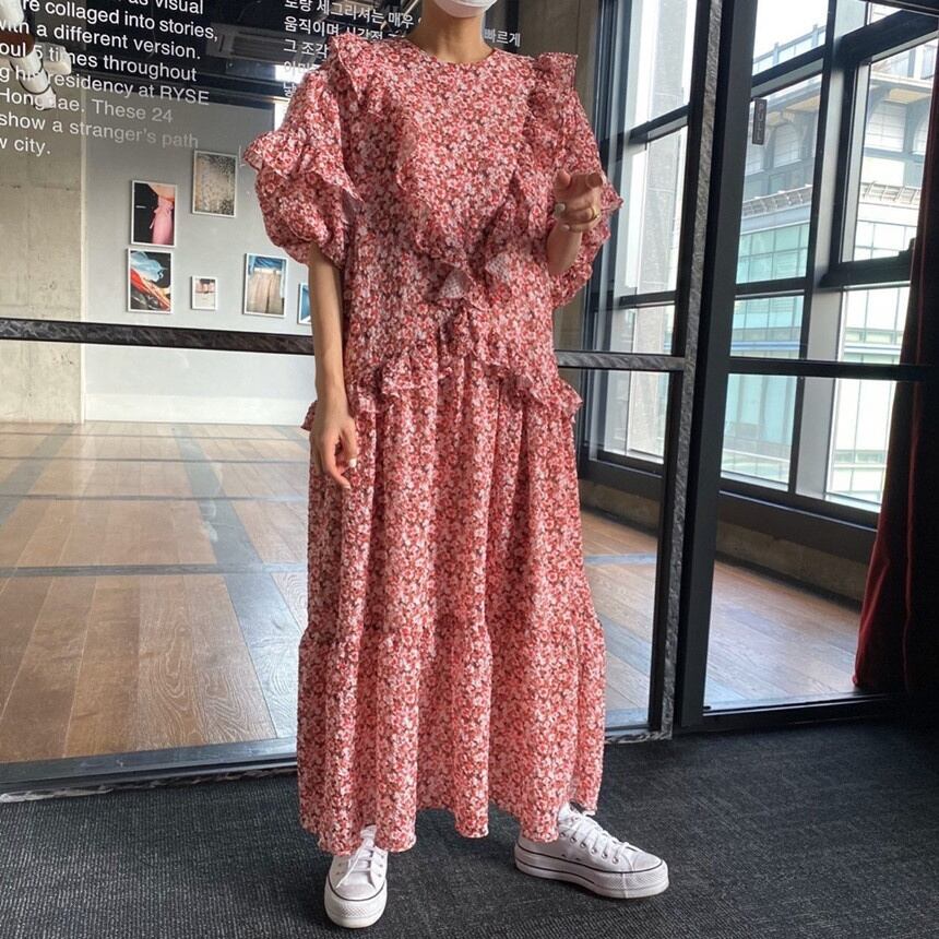 [EWQ] レディース ブルー プリント フリル ロング ドレス O ネック ショート パフ スリーブ 秋 夏 ルーズ ラッフル サマー 夏物 オータム 秋物 Oネック