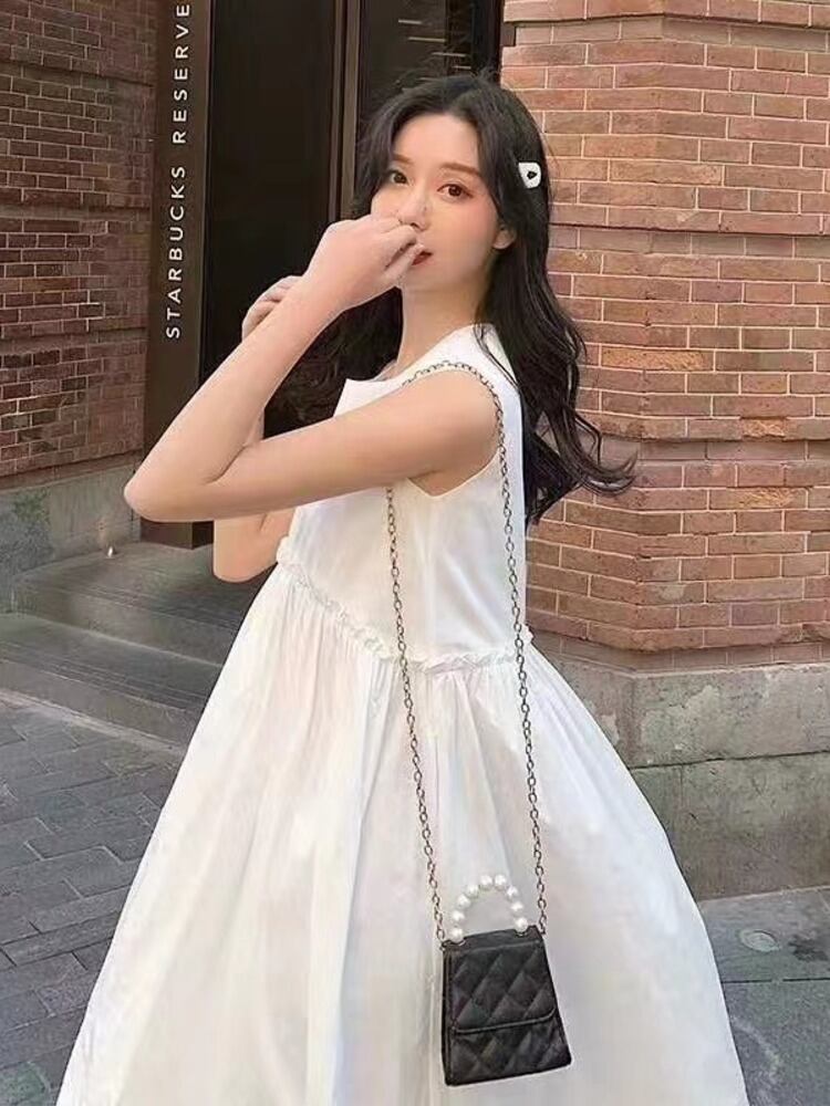 [EWQ] シンプルフリル パッチワーク ベスト ドレス無地ノースリーブ ルーズ ドレス夏 Vestido Y7624 サマー 夏物 ソリッドカラー