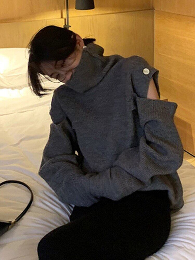 [EWQ] セクシー ショルダー ストラップレス 長袖 グレー セーター 春 タートルネック プルオーバー ルーズ ニット レディース 美しいトップス ロング スプリング 春物