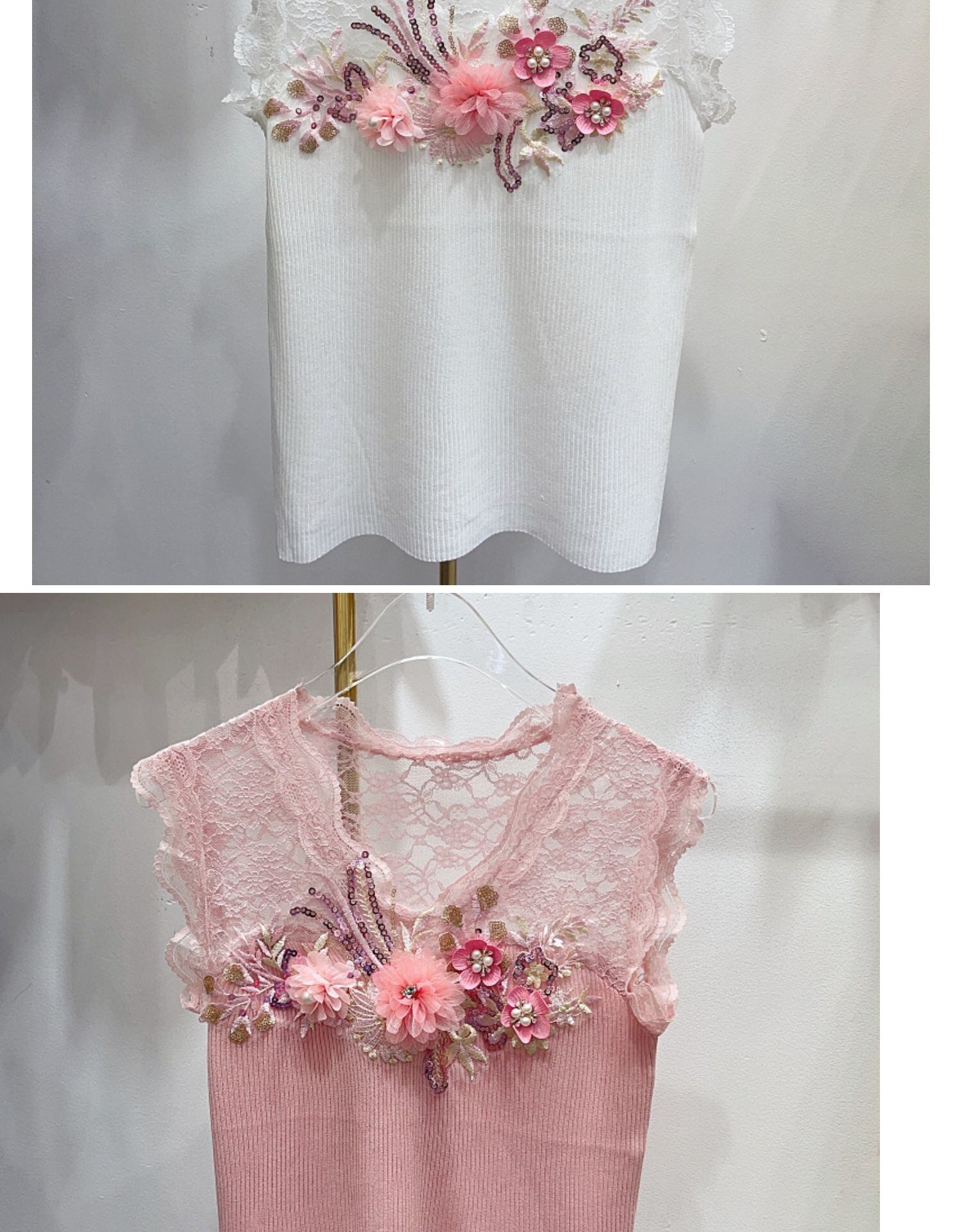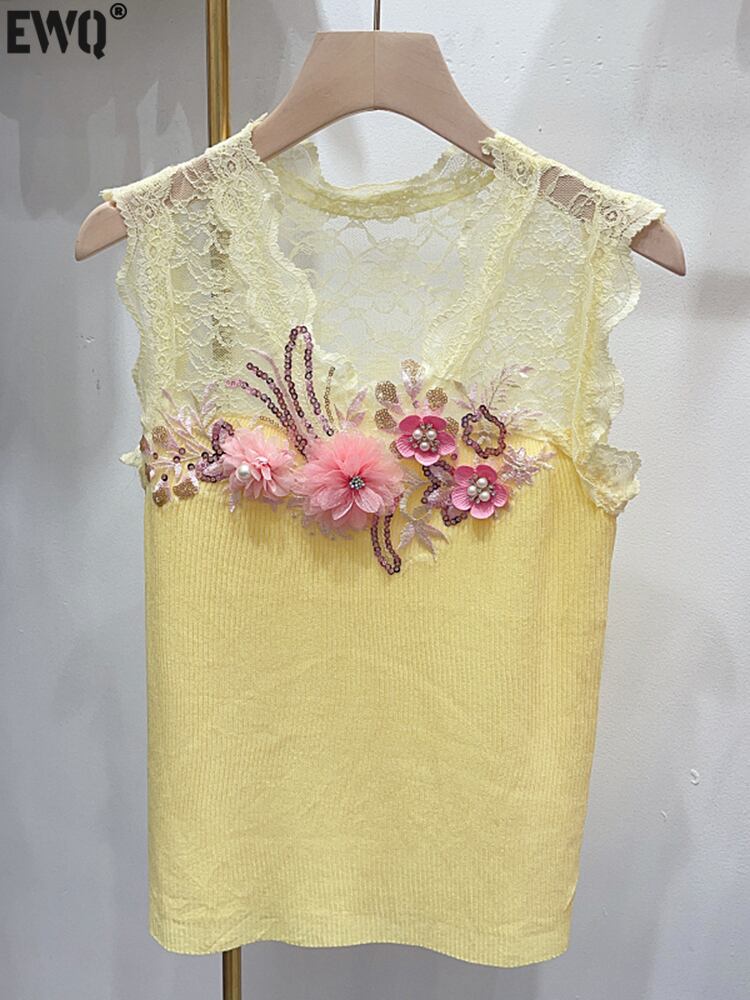 [EWQ] ビーズ 3D フラワー ニット Tシャツ ノースリーブ レース透視コントラスト カラー ニット Tシャツ サマー トップ 夏物 フラワーデザイン