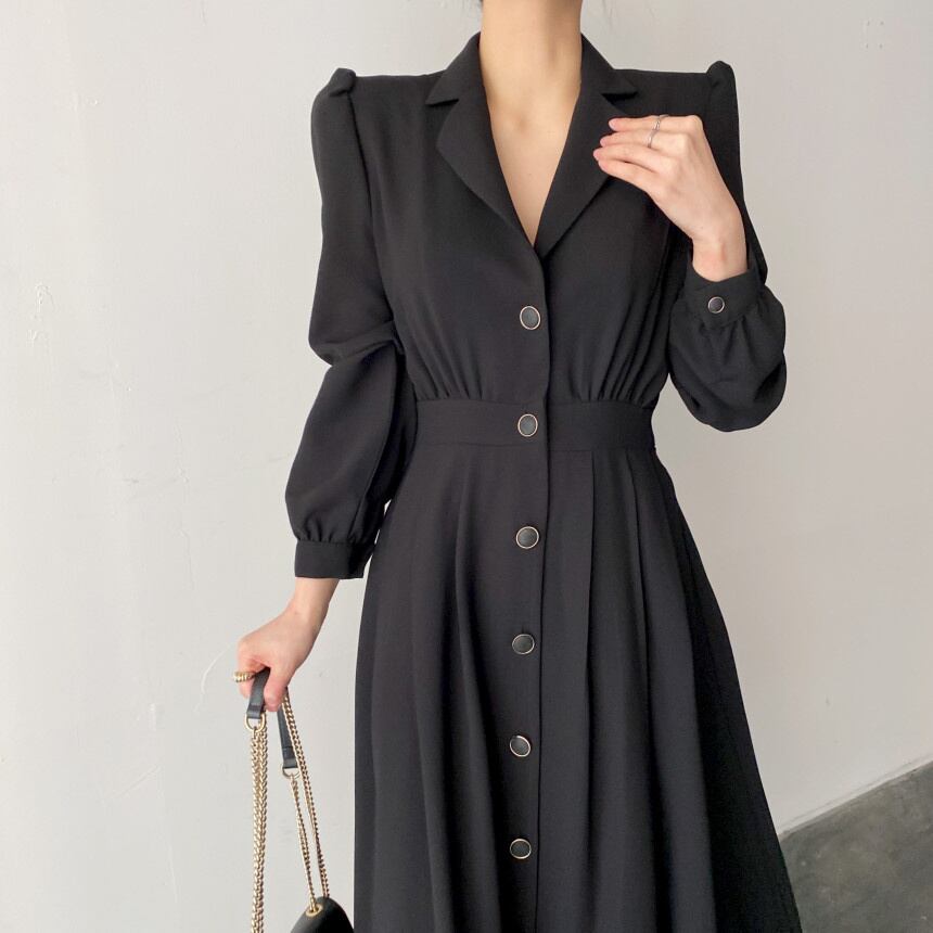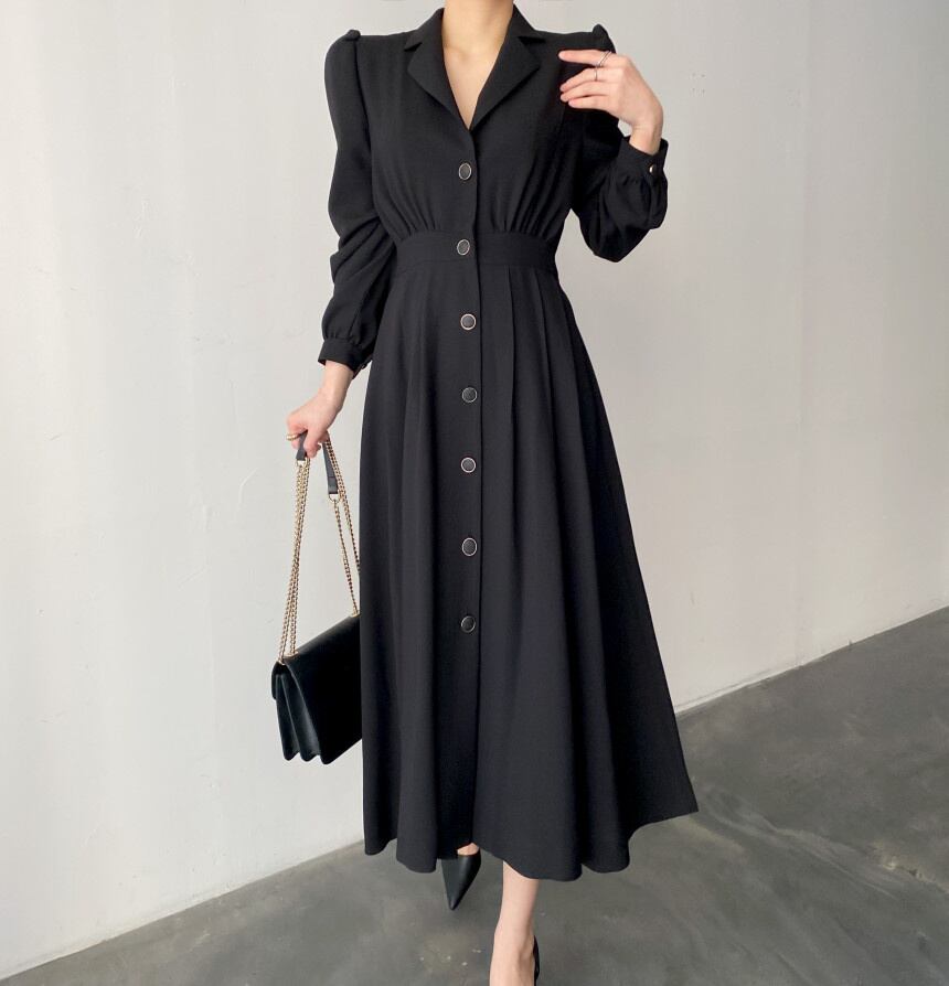[EWQ] レディース シングル ブレスト プリーツ ウエスト ドレス ラプル 無地 ランタン スリーブ マキシ ドレス 春 秋 Rode 7544 ランタンスリーブ スプリング 春物 オータム 秋物 ソリッドカラー