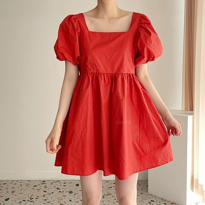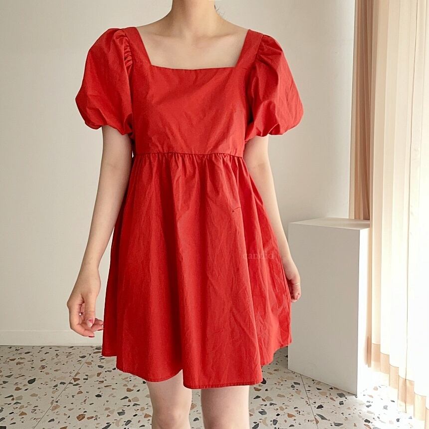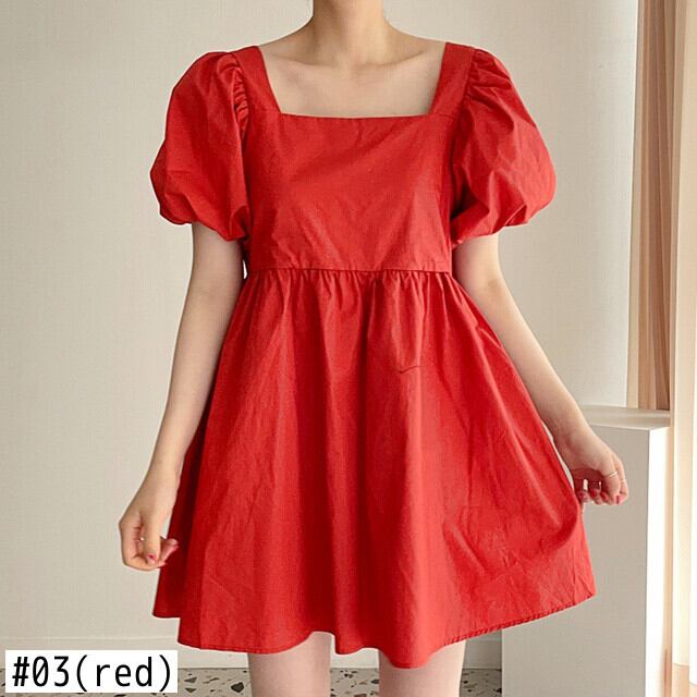 [EWQ] スクエア カラー プリーツ ウエスト A ライン ドレスパフ スリーブ無地ミニ ドレス春夏 Vestido 68 スプリング 春物 サマー 夏物 Aライン ソリッドカラー スクウェア