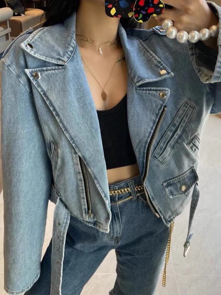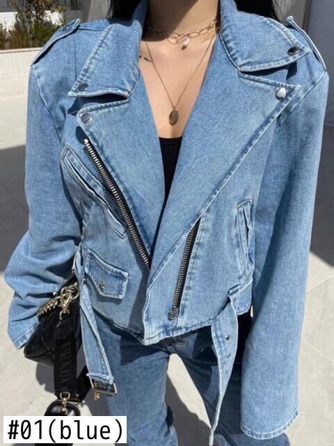 [EWQ] ジッパースプライシングショートデニムジャケットストリート包帯ラプル長袖ジャケットコート春秋トップ ロング スプリング 春物 オータム 秋物