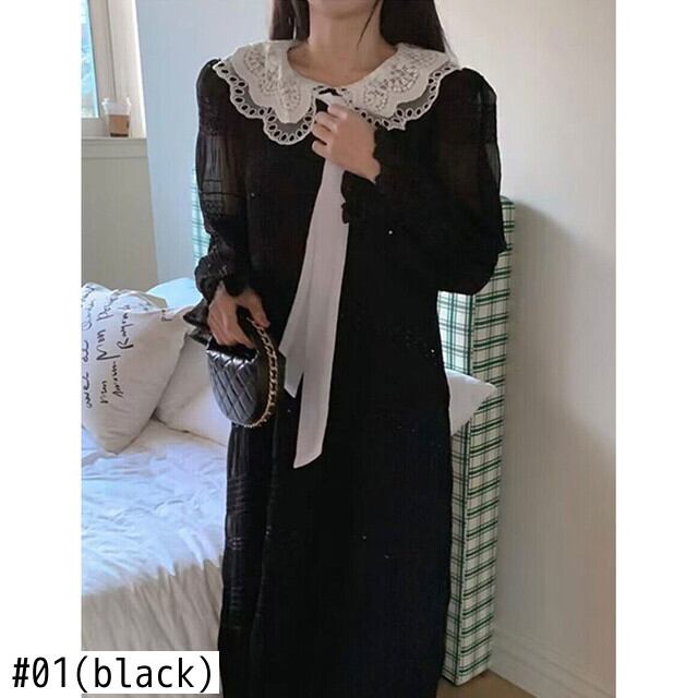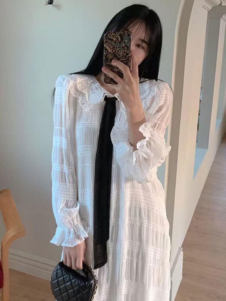 [EWQ] 中空アウト襟レースタイ A ラインドレスフレアスリーブソフトマキシドレス春秋 Vestido 614 スプリング 春物 オータム 秋物 Aライン