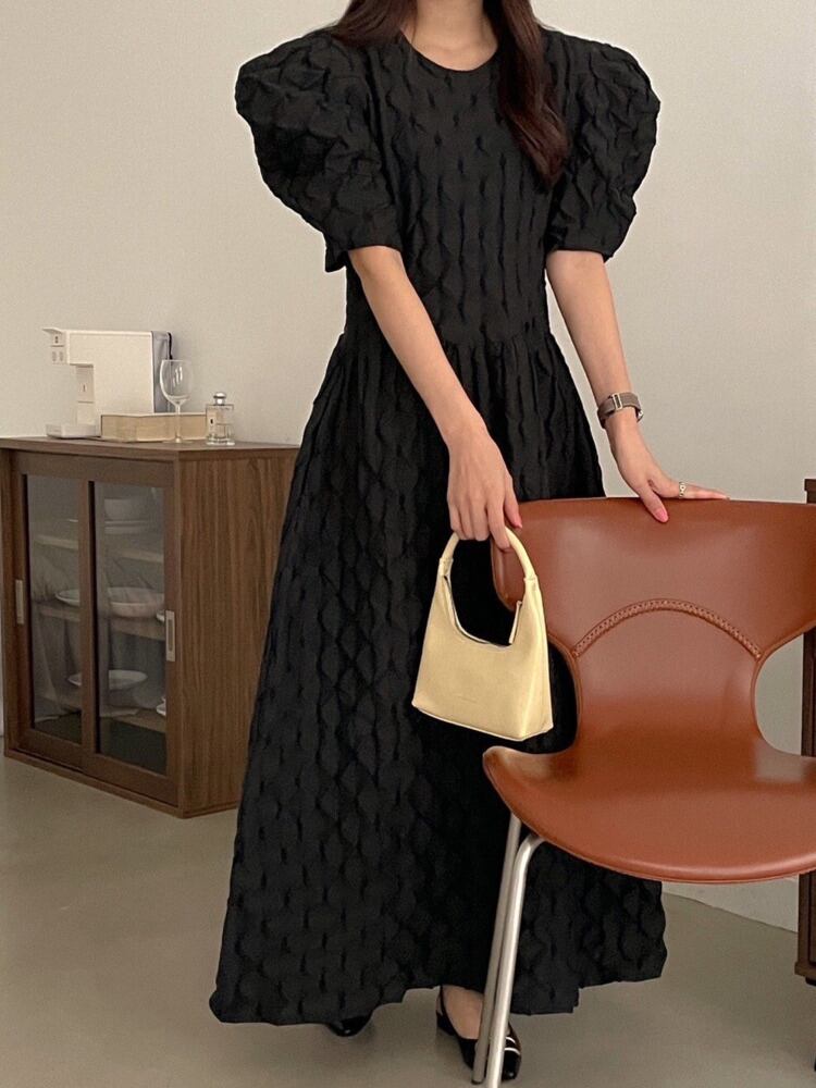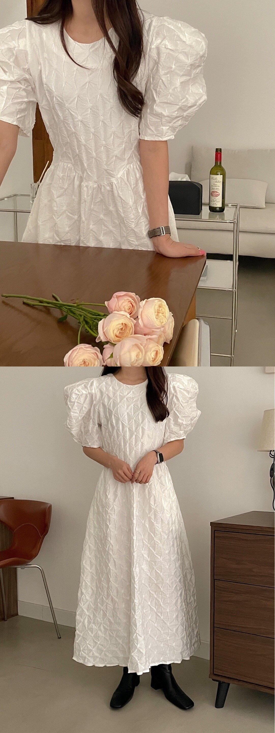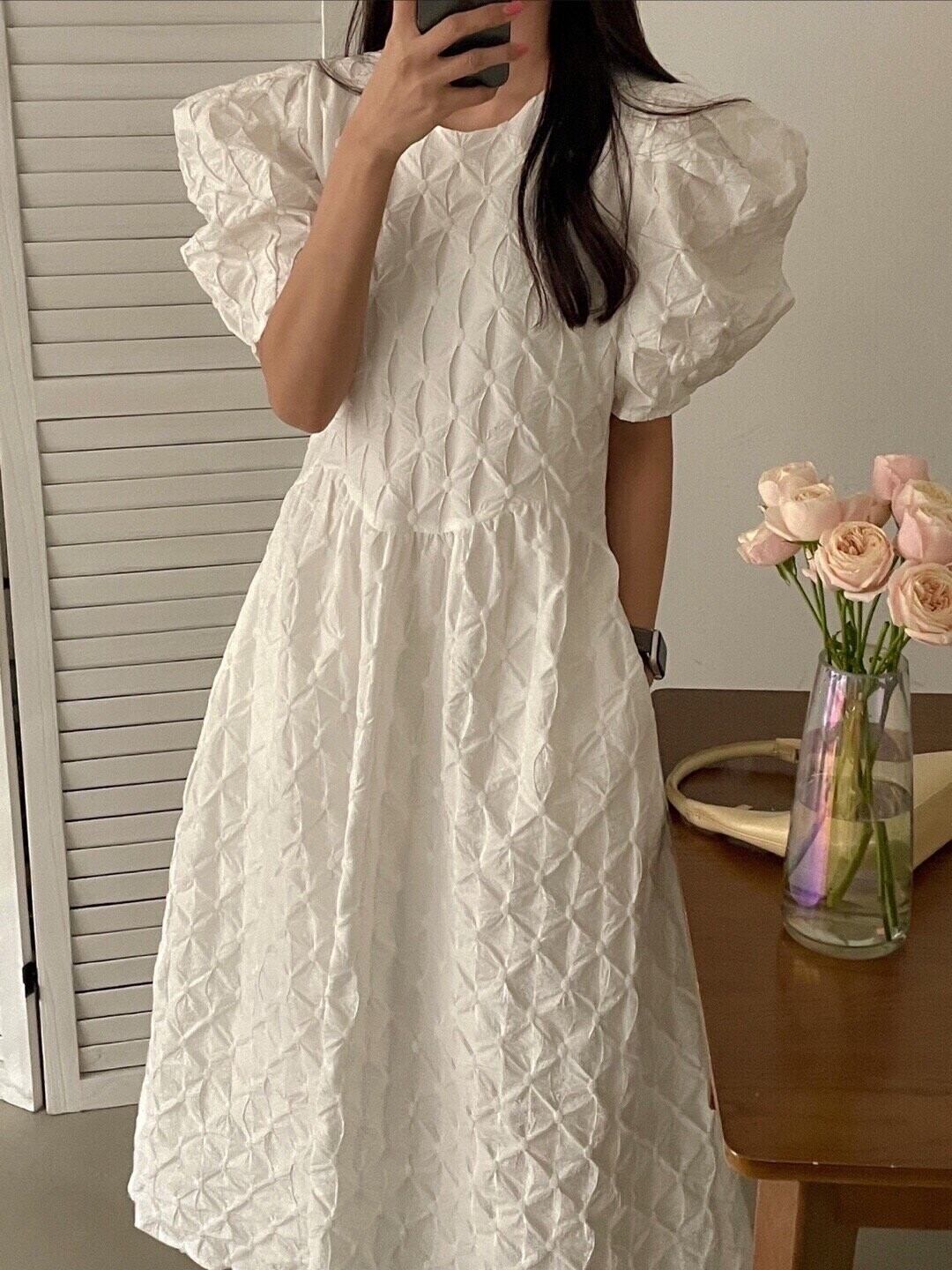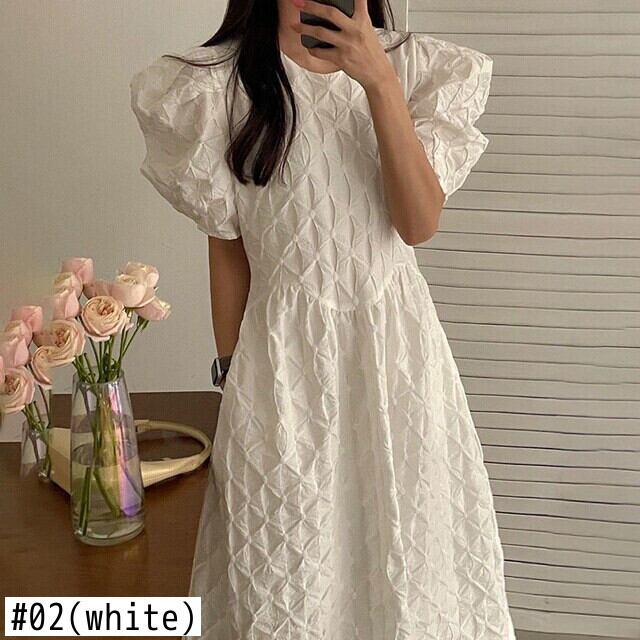 [EWQ] シック O ネック パフ スリーブ ホワイト チェック柄ドレスマキシ ドレス夏美しい Vestido サマー 夏物 Oネック