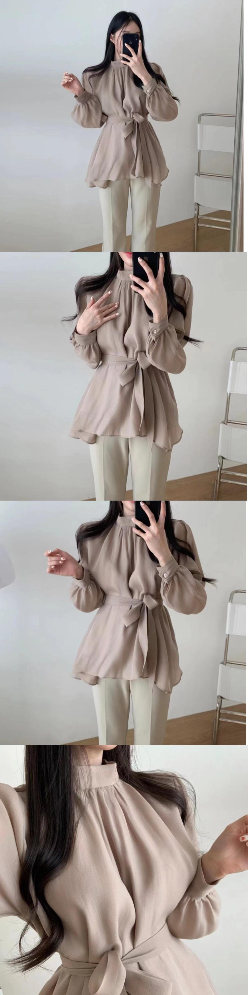 【EWQ】スタンドネック プリーツ レースアップシャツ 春 秋 ランタンスリーブ トップス 253 スプリング 春物 オータム 秋物