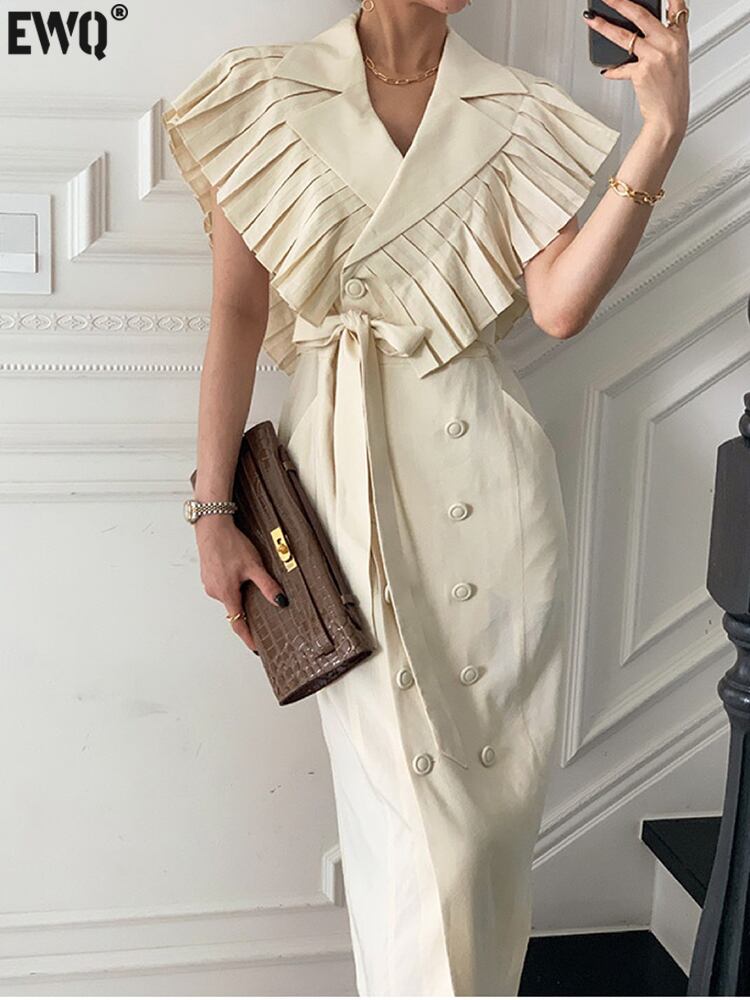 [EWQ] Vestidos ビッグ ターンダウン カラー モダン レディー ドレス パネル ローブ サムナー ダブルブレスト 気質
