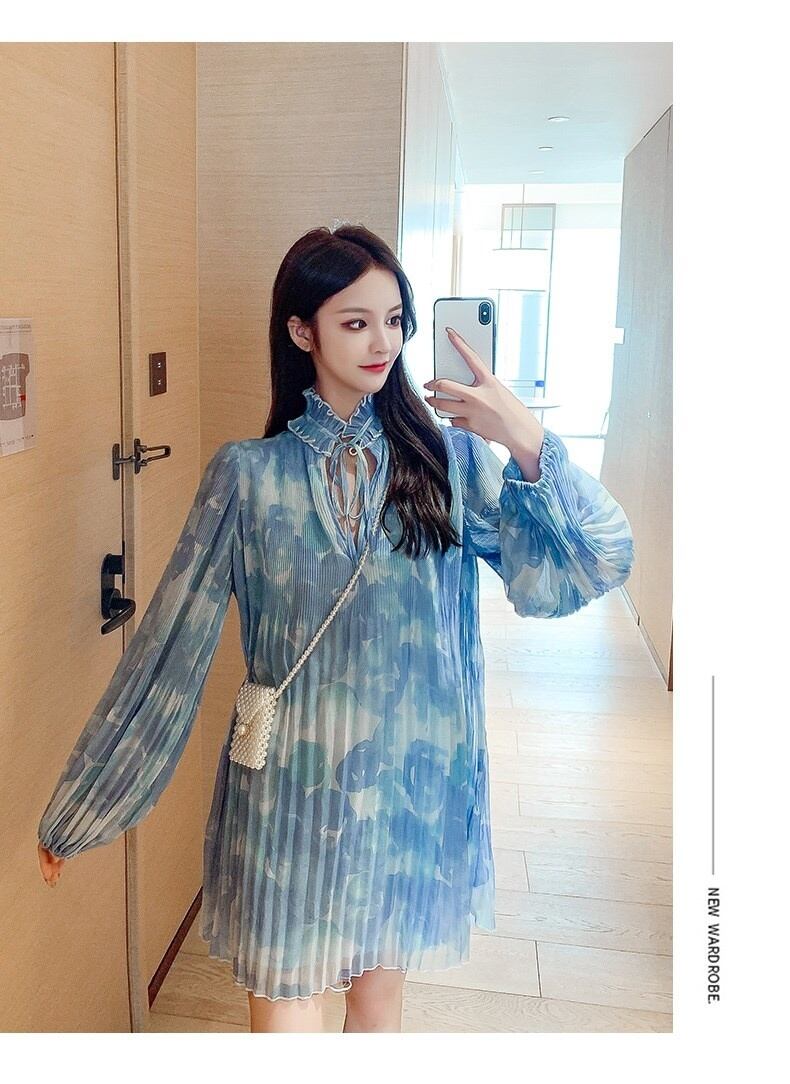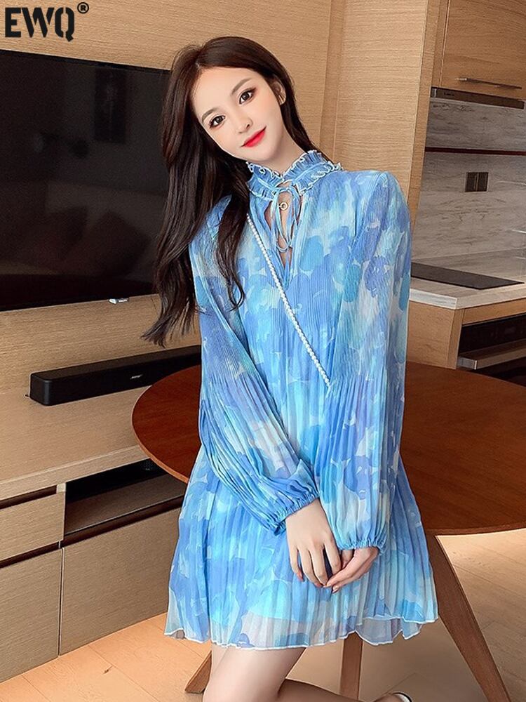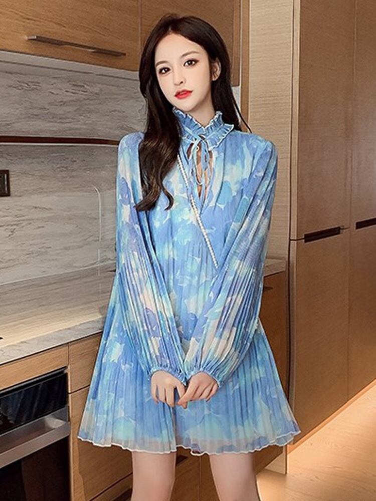[EWQ] タイダイプリントミニドレス甘いレースアップ襟中空アウト美しいドレス春夏プリーツ Y6481 大人ガーリー スウィート キュート カジュアル スプリング 春物 サマー 夏物
