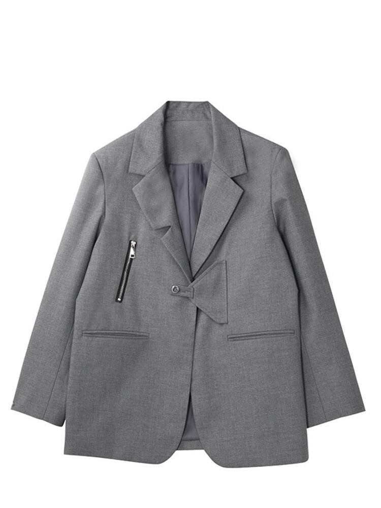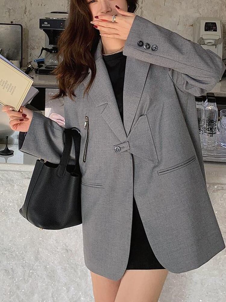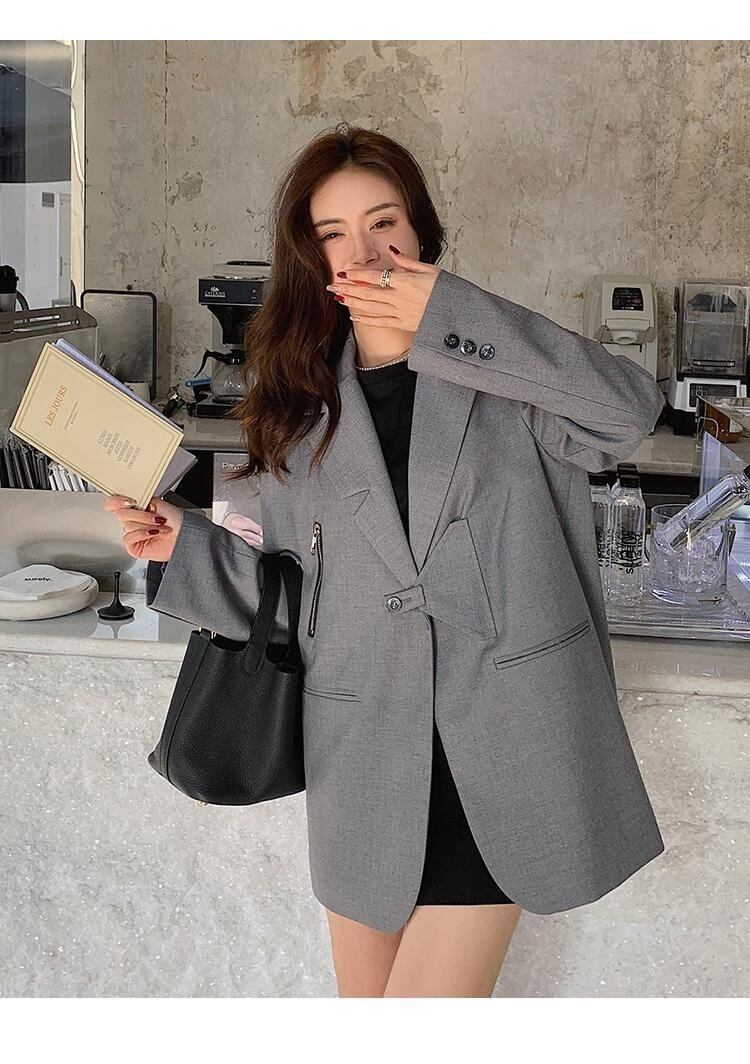 [EWQ] シングル ボタン グレー ブレザー コート長袖無地スーツ ジャケット春秋ポケット トップ 6757 ロング スプリング 春物 オータム 秋物 ソリッドカラー