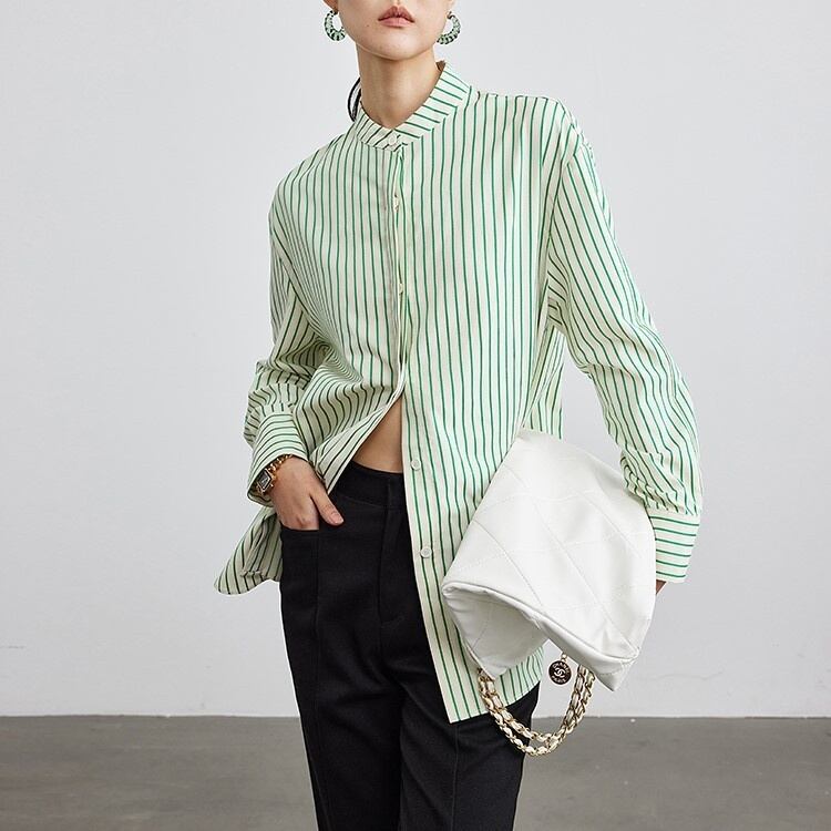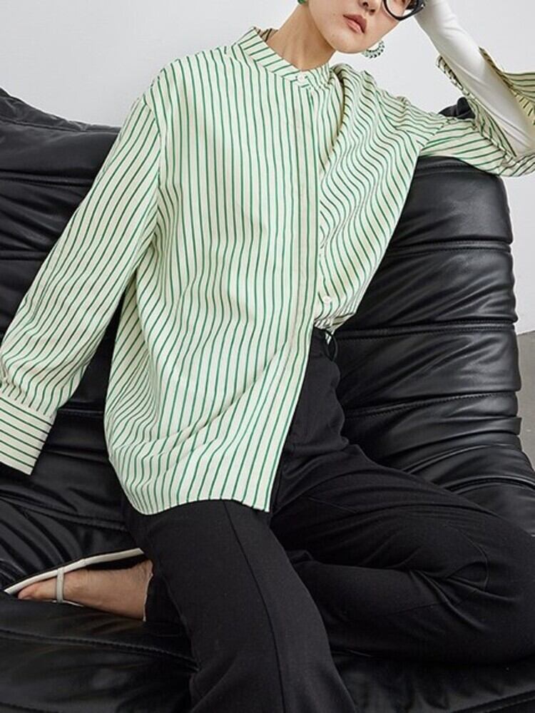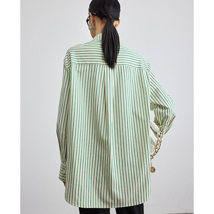 [EWQ] ストライプ長袖シャツシングルブレストルーズブラウストップス春夏トレンドシャツ 16Y5868 ロング スプリング 春物 サマー 夏物