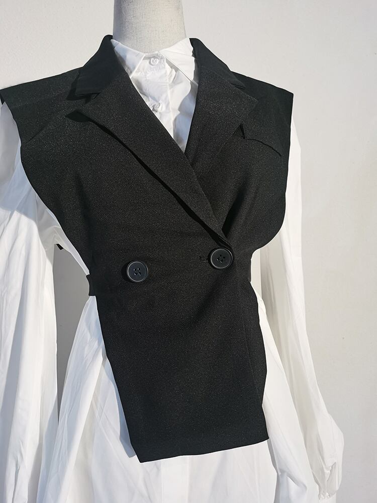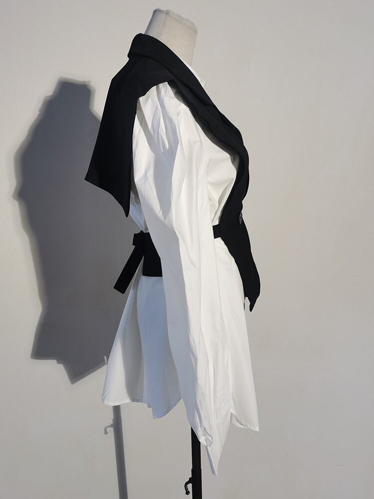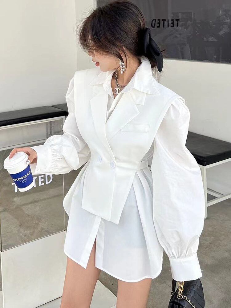 [EWQ] フェイク ツー センス グリーン ドレス ラペル ウエスト コントラスト ロング スリーブ ミニ ドレス レディース Antumn 16Y360 長袖