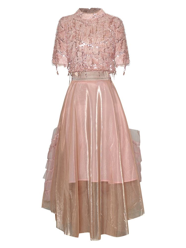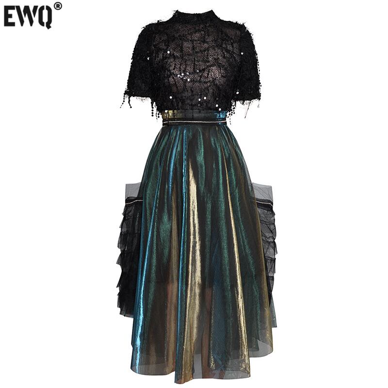 [EWQ] できる フリル スカート パーティー ツーピース スーツ レディース セット ゴージャス テル スパンコール 装飾 トップス