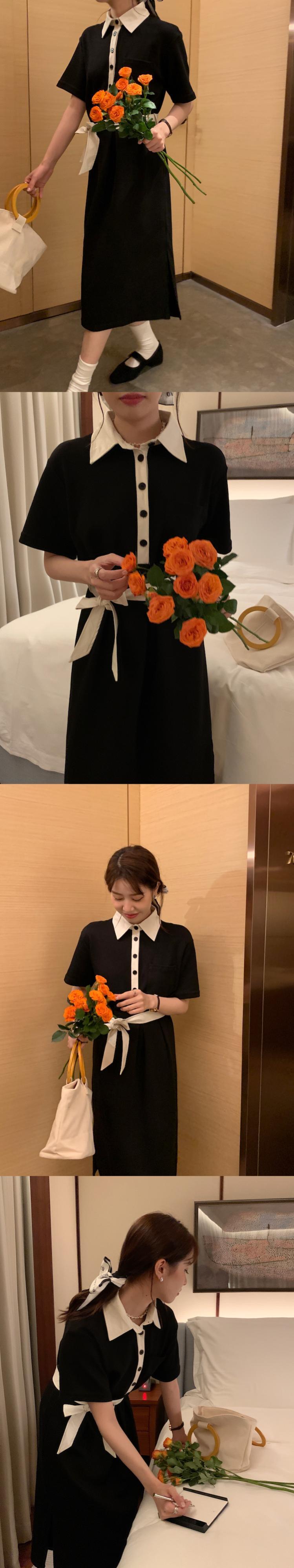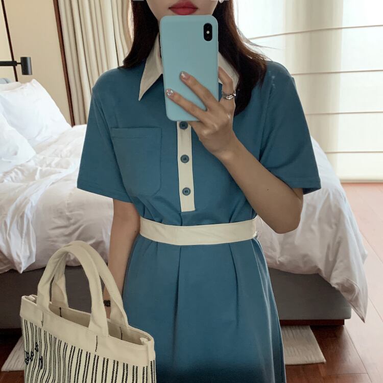 [EWQ] ラプル コントラスト PU レザー スプライシング レースアップ ドレス半袖ボタン Tシャツ ドレス夏潮 Vestido 130 ショート ハーフスリーブ サマー 夏物