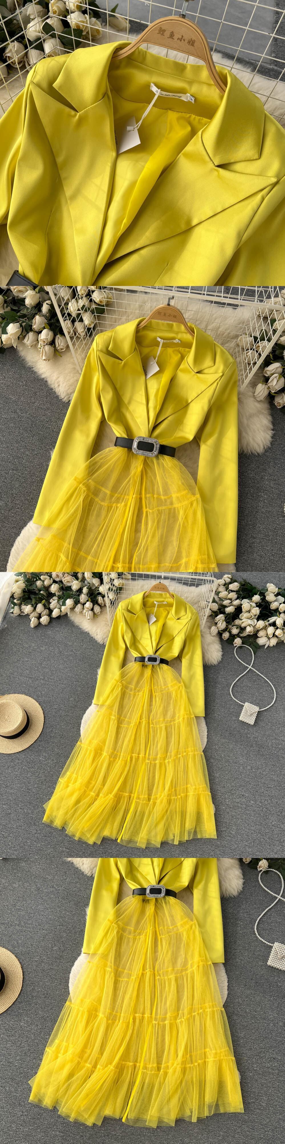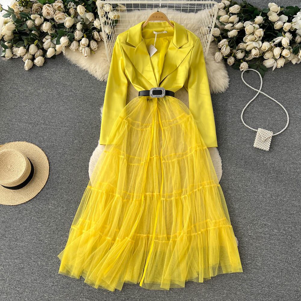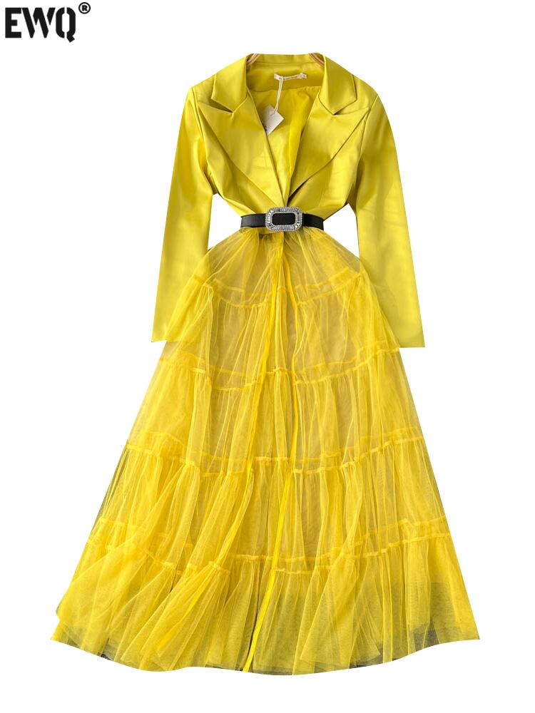 [EWQ] 長袖 V ネックスプライス メッシュ ドレス夏潮ガーゼ パッチワーク レースアップ シフォン ドレス Vestido ロング サマー 夏物 Vネック